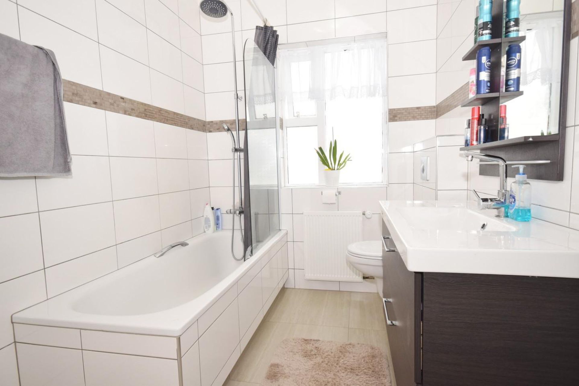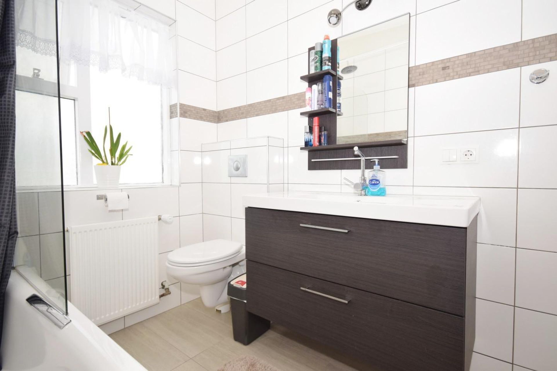 Baðherbergi: Er með innréttingu með handlaug og skápum, baðkar með sturtu, handklæðaofni, upphengt salerni og glugga með opnanlegu fagi.