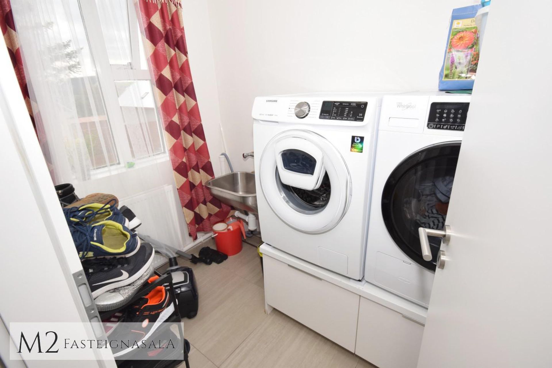 Þvottahús: Er inn af forstofu og er með sturtuklefa, handlaug og nettum hvitum vaskaskáp, innréttingu fyrir þvottavél og þurrkara og glugga með opnanlegu fagi. (Skráð sem geymsla á teikningu)