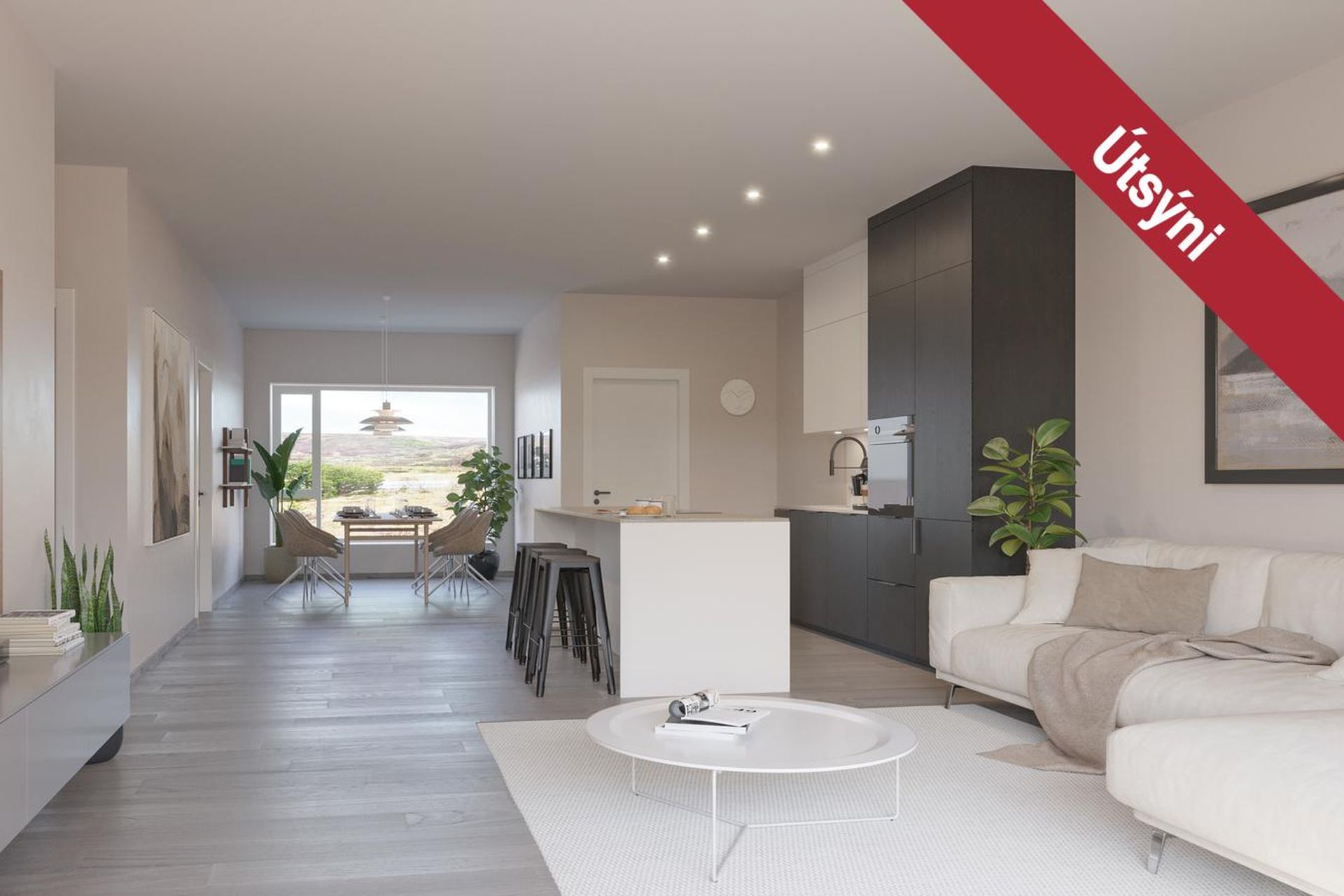 AlrýmiSamliggjandi stofa og borðstofa í opnu og björtu rými með niðurlímdu viðarparketi. Gólfsíðir gluggar tryggja mikla náttúrulega birtu og að útsýnið njóti sín. Gardínur eru rafstýrðar. Útgengi er á stórar 55,6 m2 þaksvalir frá alrýminu.