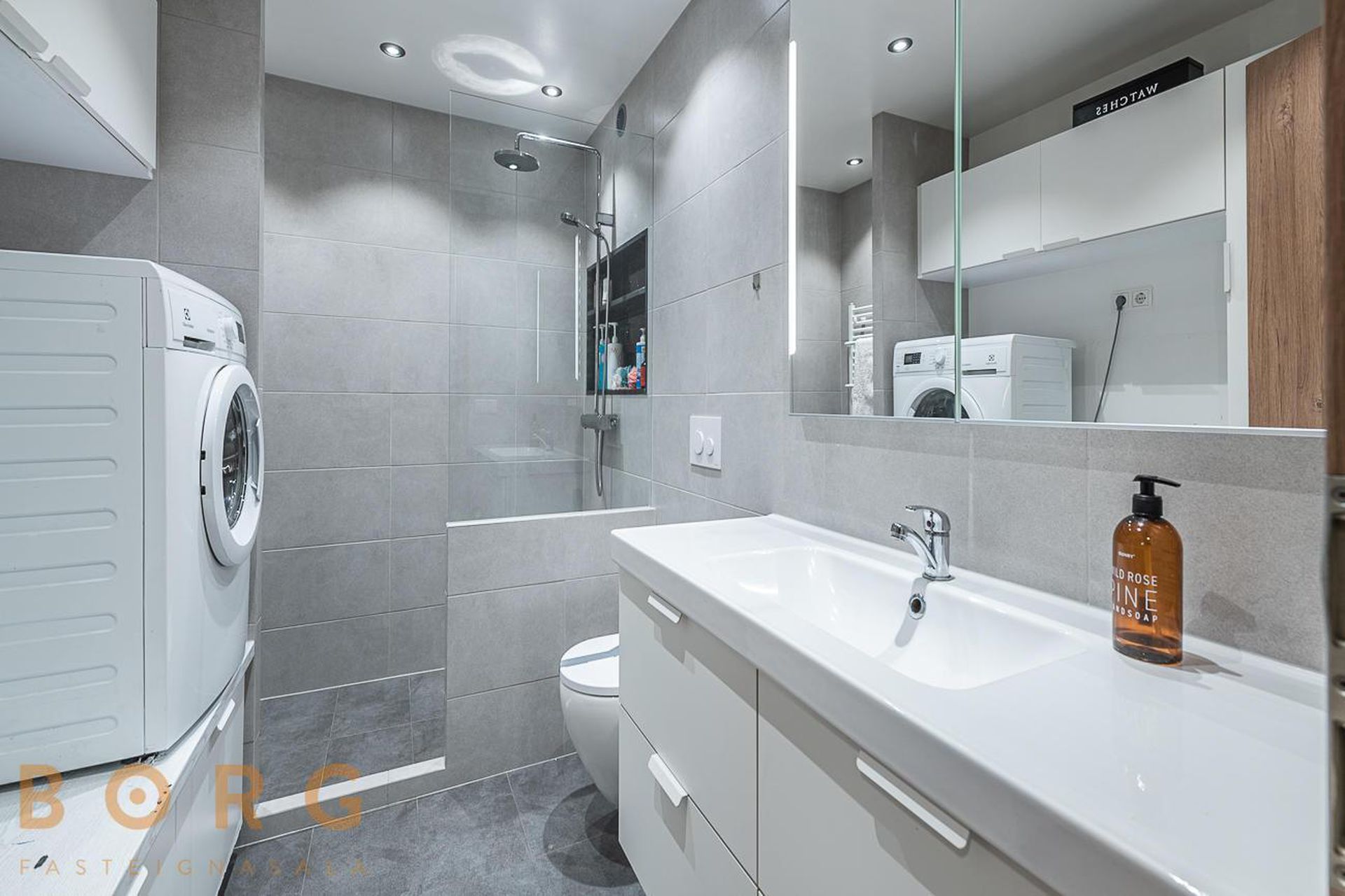 Baðherbergi er með tvöfaldri sturtu, innréttingu og mjög góðri þvottaaðstöðu. GÓLFHITI