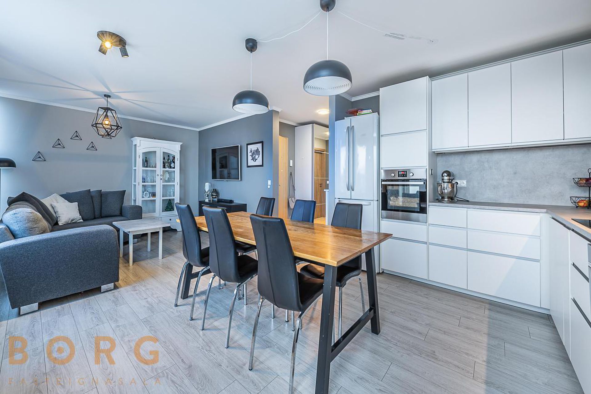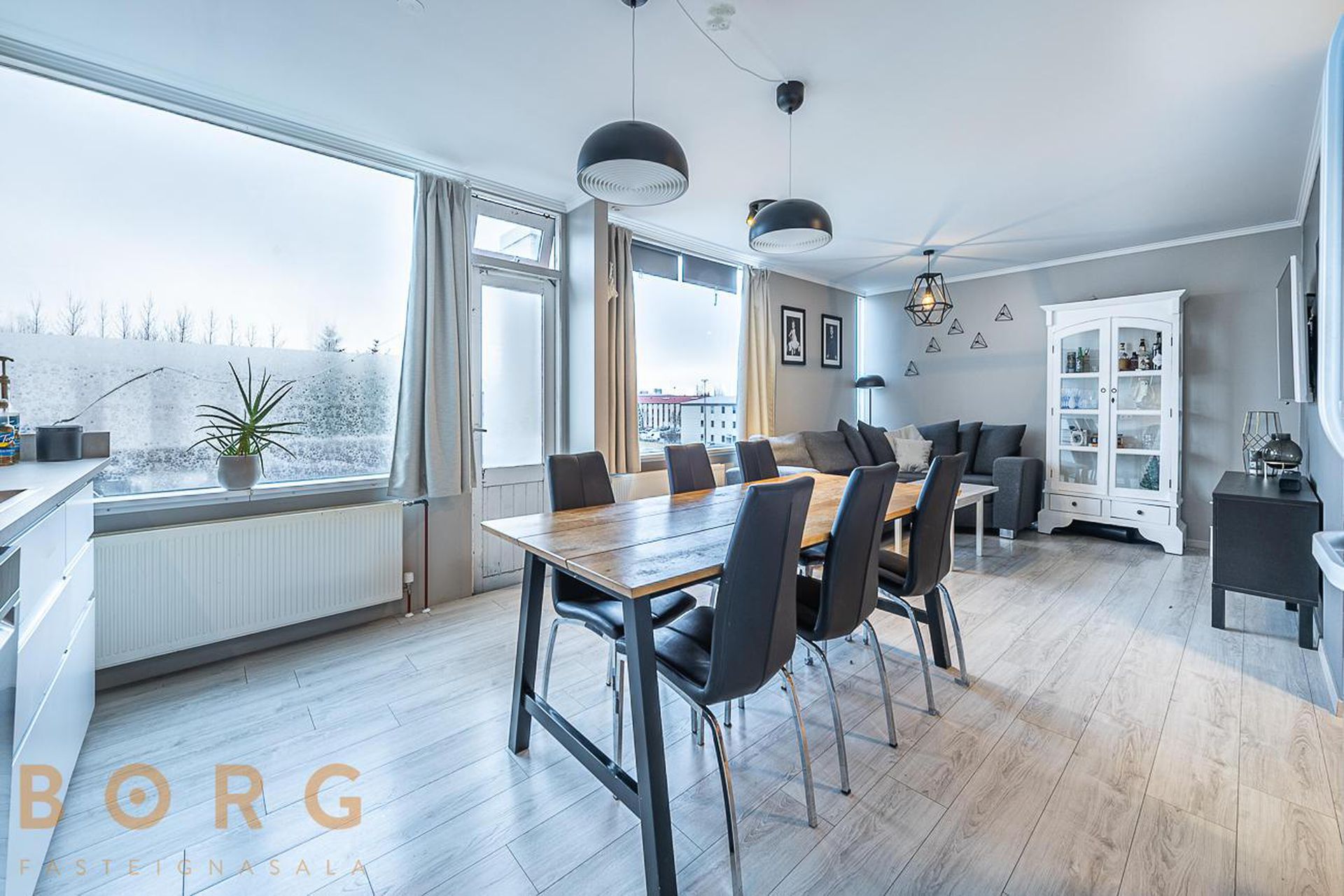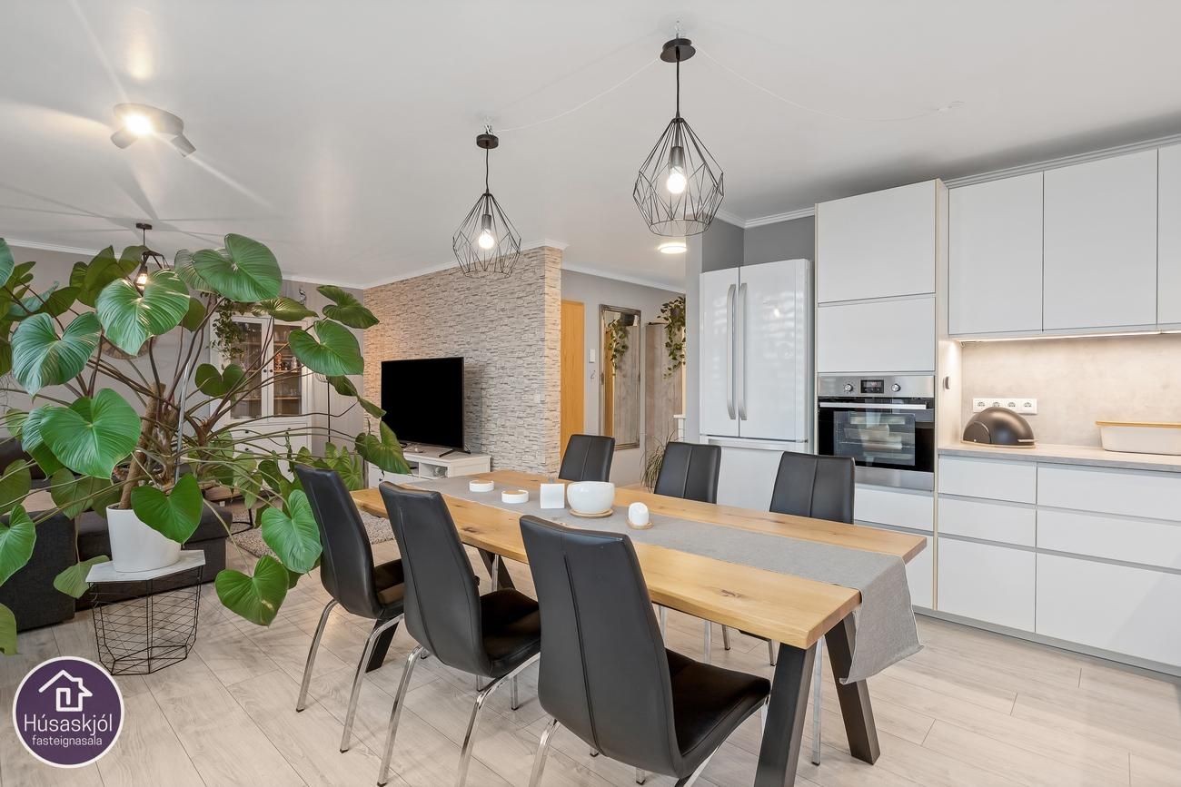 Eldhús/stofa og borðstofa eru í björtu alrými hvít eldhúsinnrétting og útgengi út á svalir.