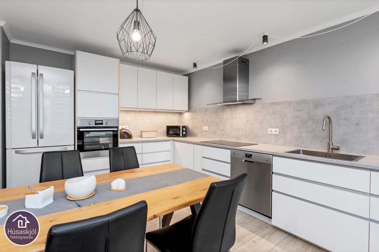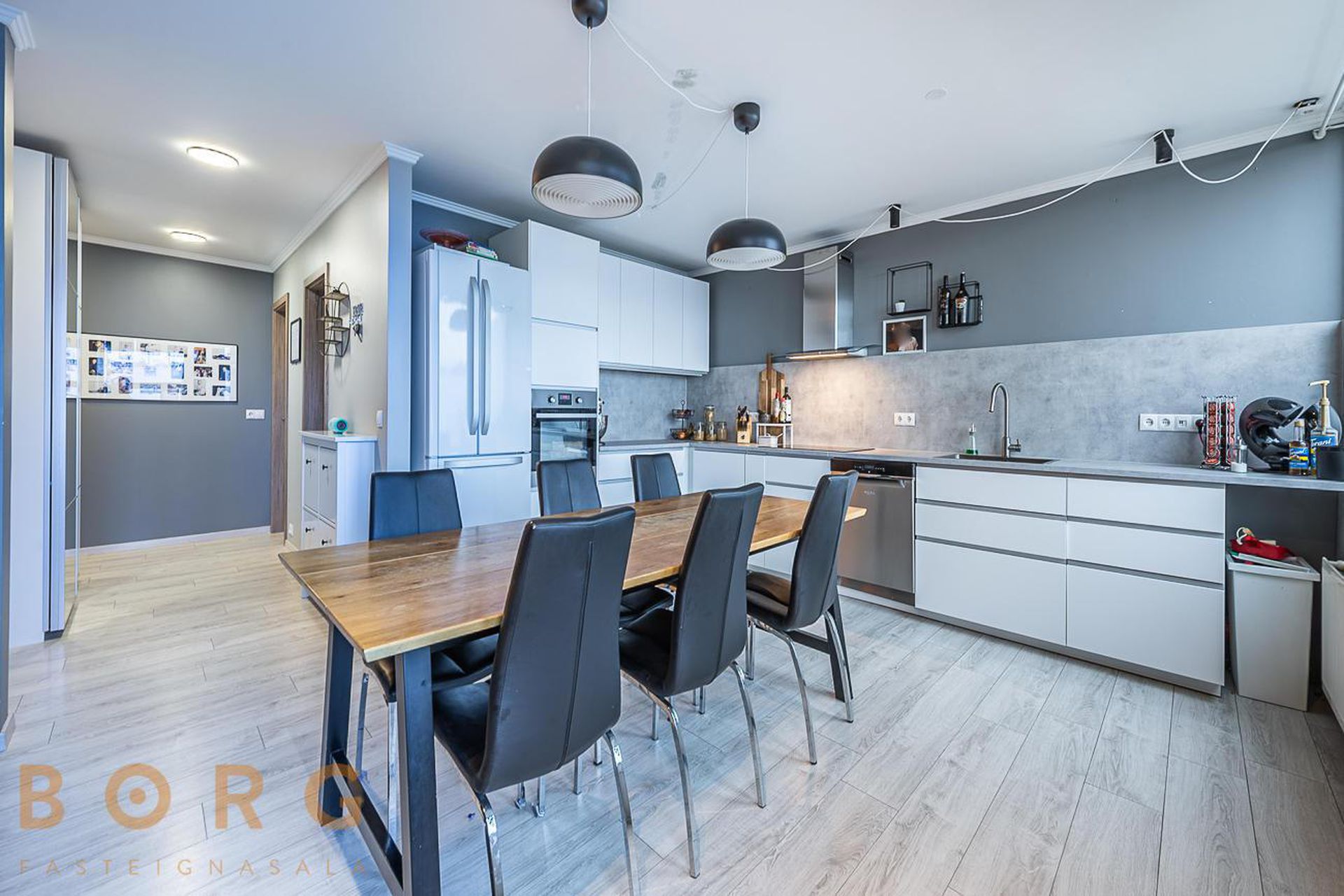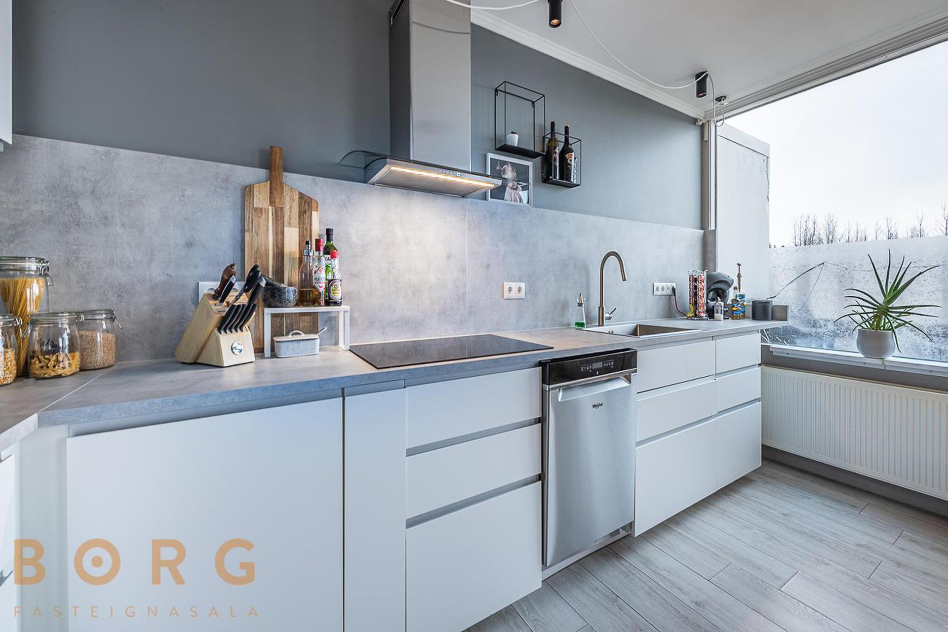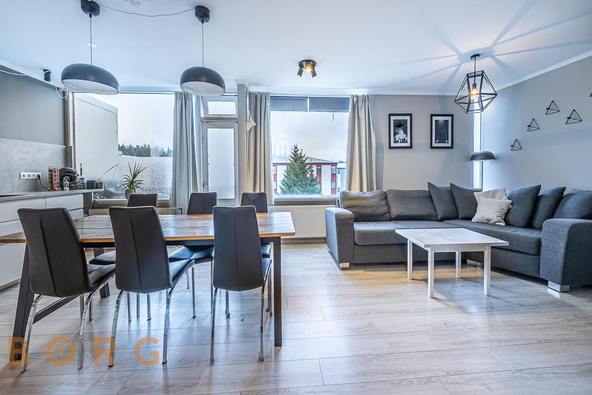 Eldhús/stofa og borðstofa eru í björtu alrými hvít eldhúsinnrétting og útgengi út á svalir.