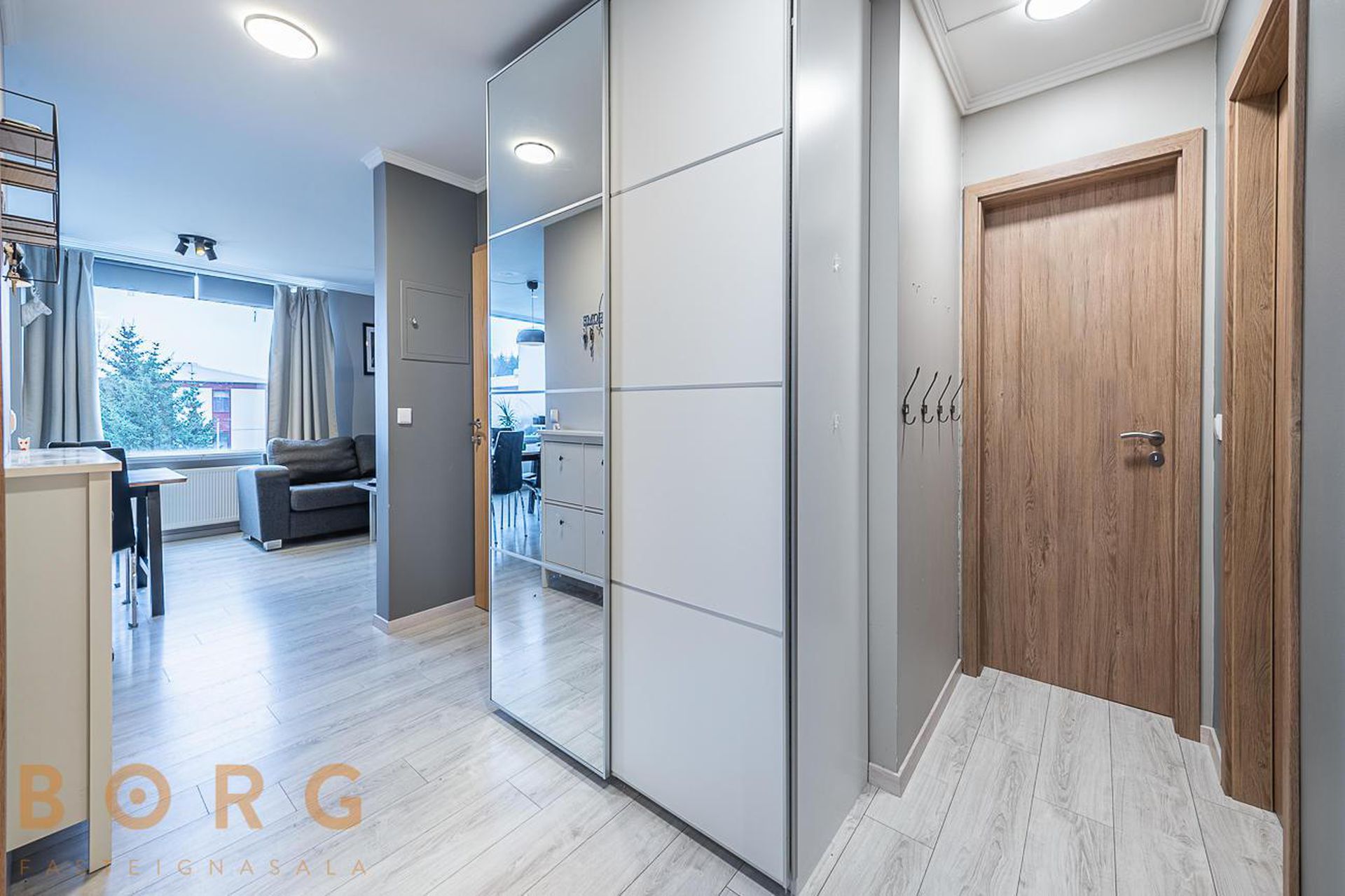 Anddyri með fataskáp.