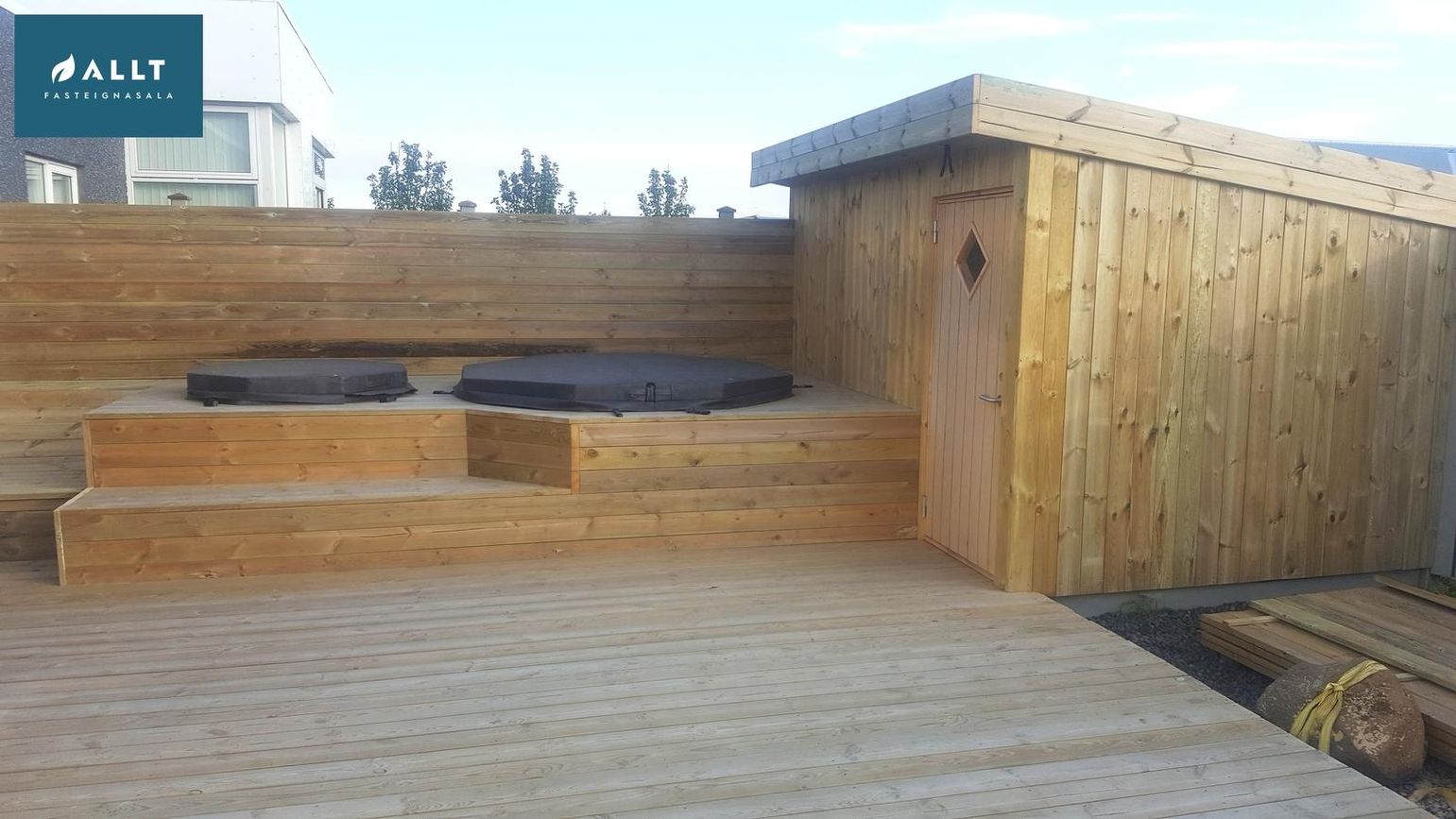 Framan við hús er hellulögð aðkoma. Baka til er góður sólpallur í suðurátt. Þar er heitur pottur og kaldur ásamt geymslu. Lagnir út eru allar með ídreignum hitavír og stjórnkerfi fyrir heitan pott er þar.