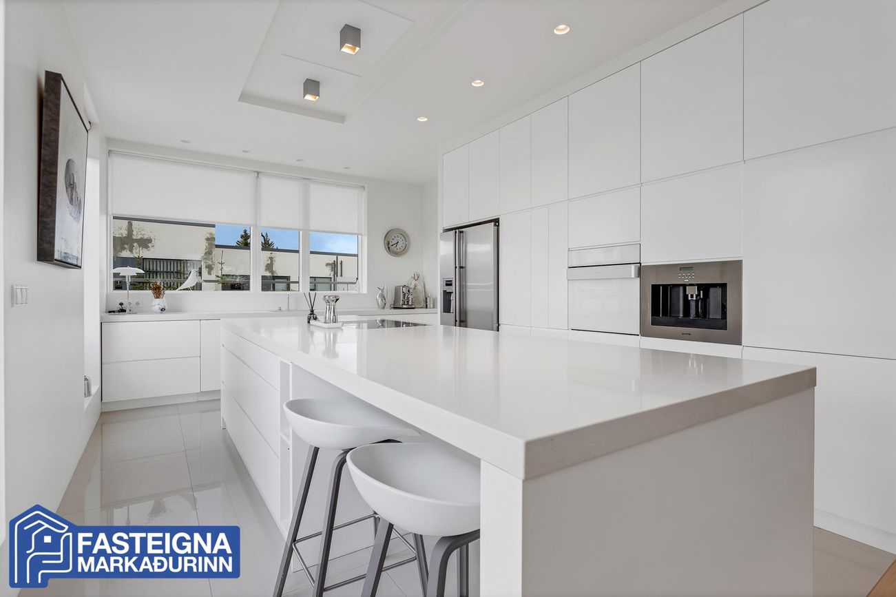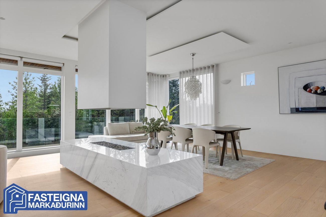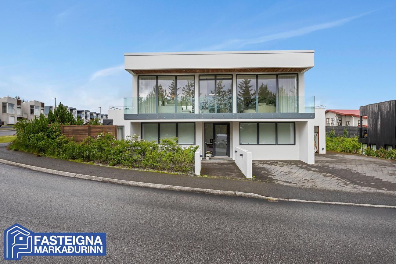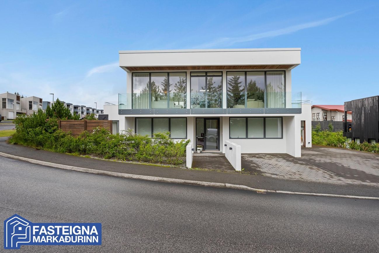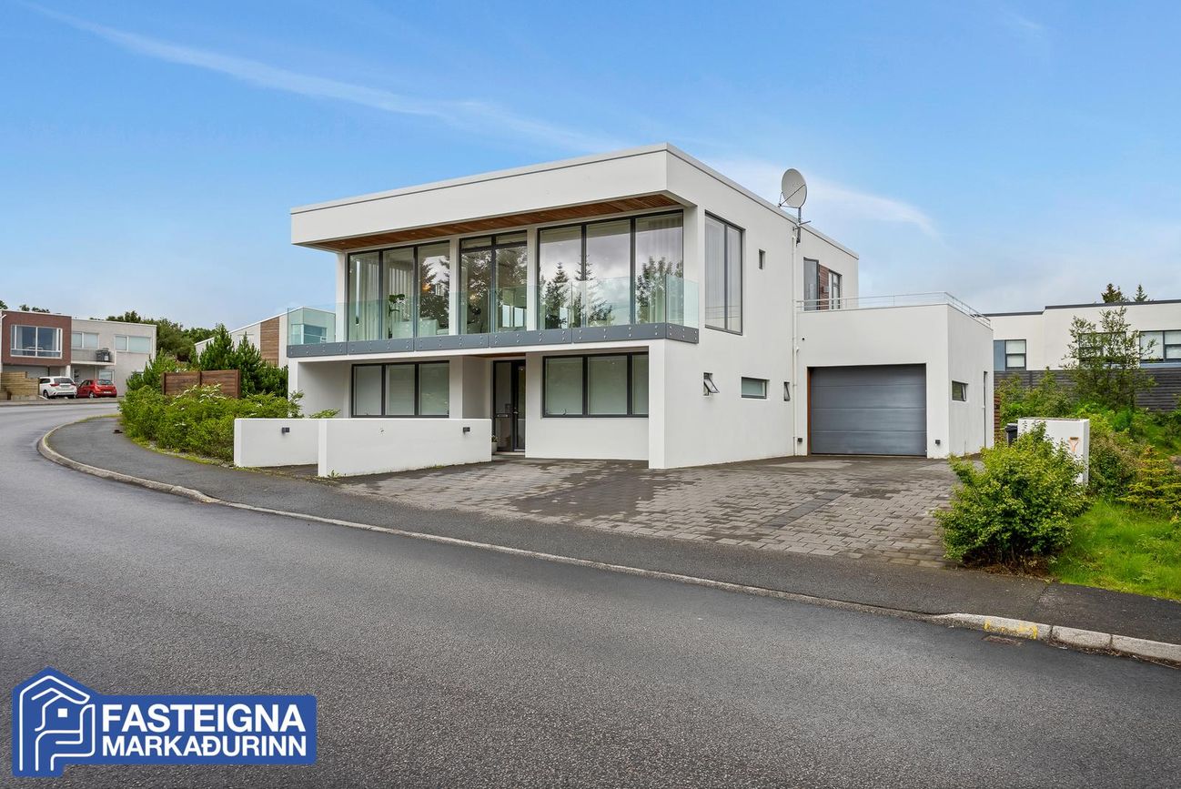 Tveggja hæða einbýlishús með sérsmíðaðri innréttingu, aukinni lofthæð og gólfhitakerfi. Skiptist í stórar stofur, eldhús með eyju, búr, þvottaherbergi og fjölmargar veröndir/svalir.