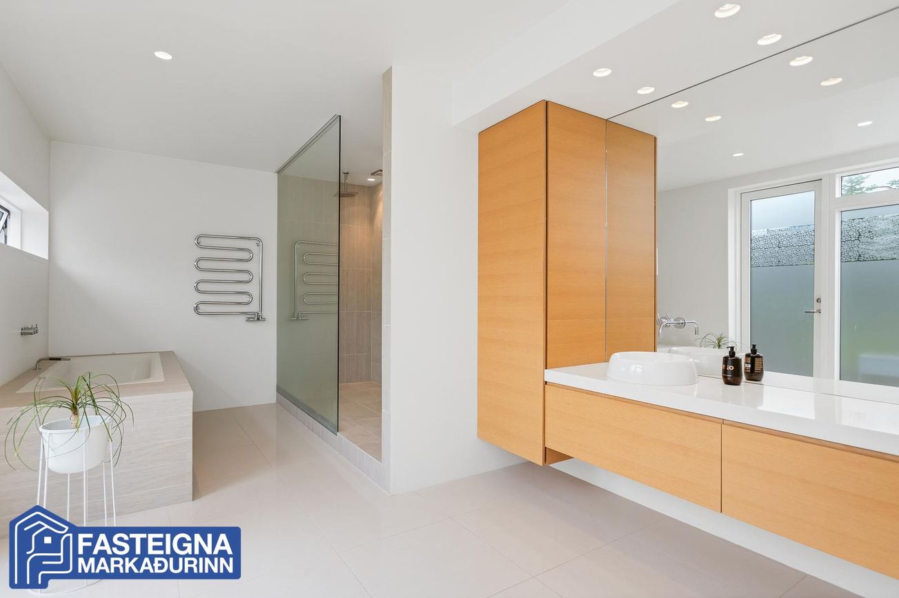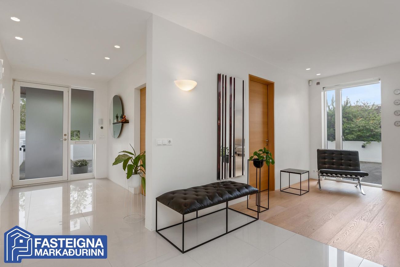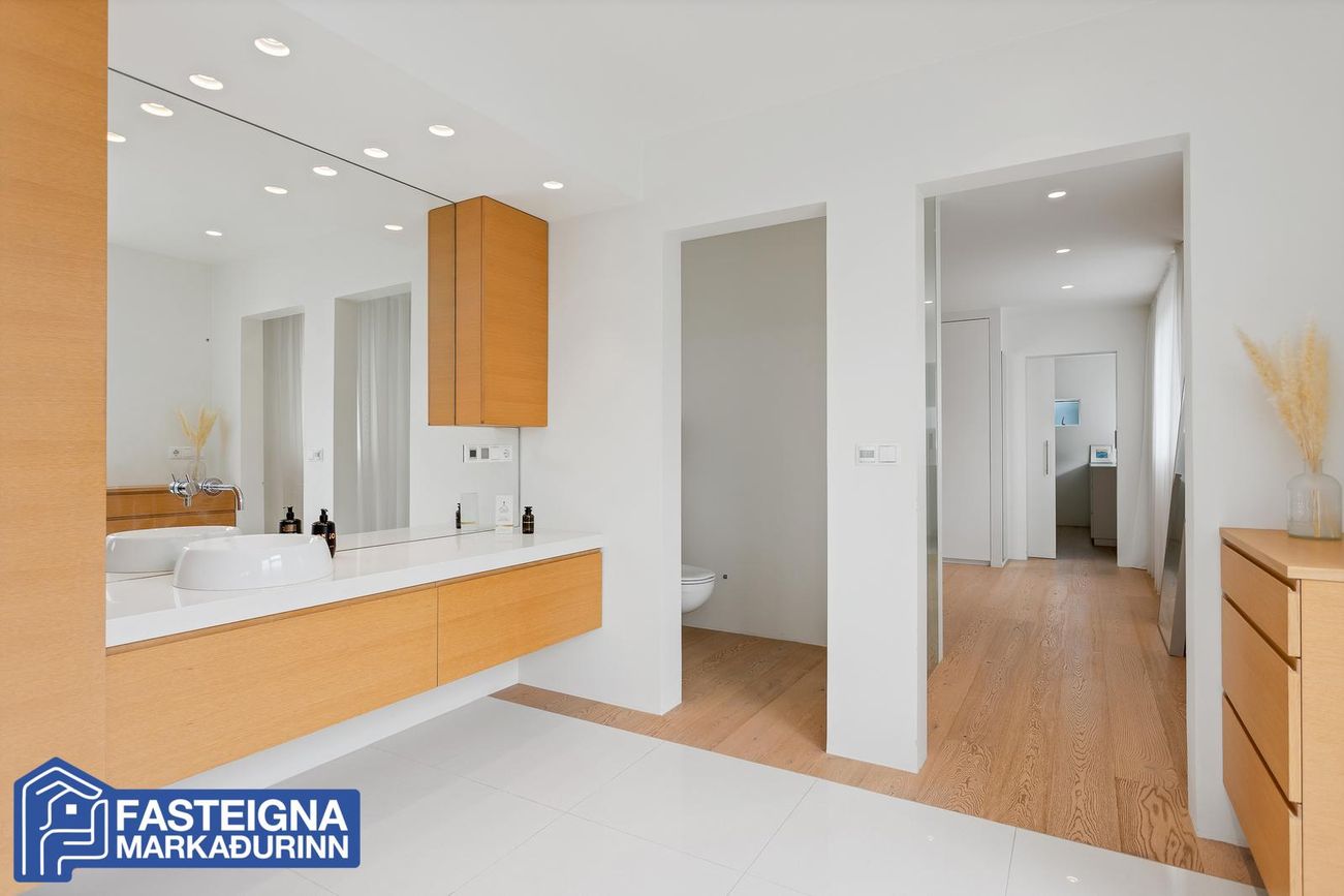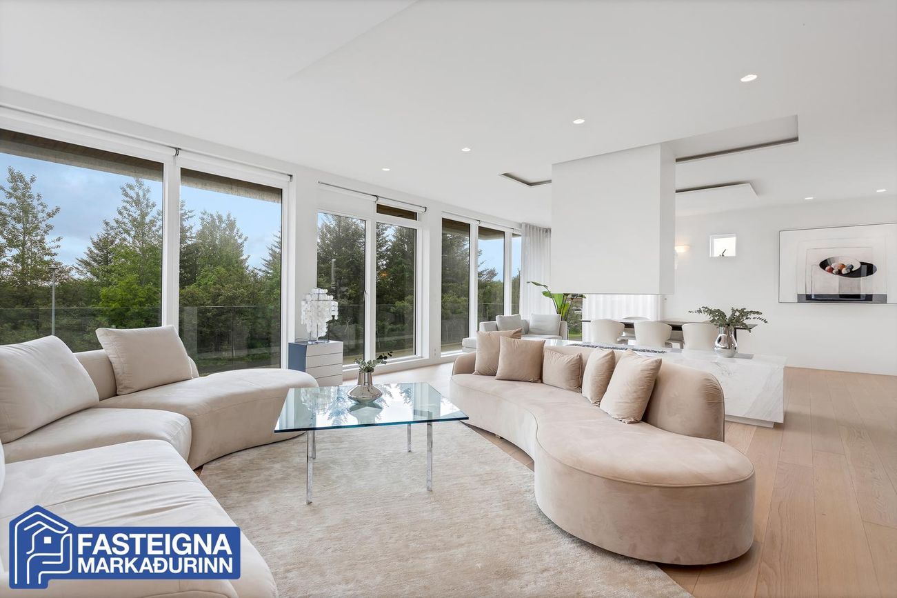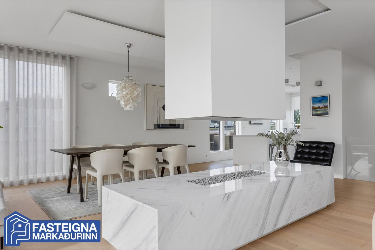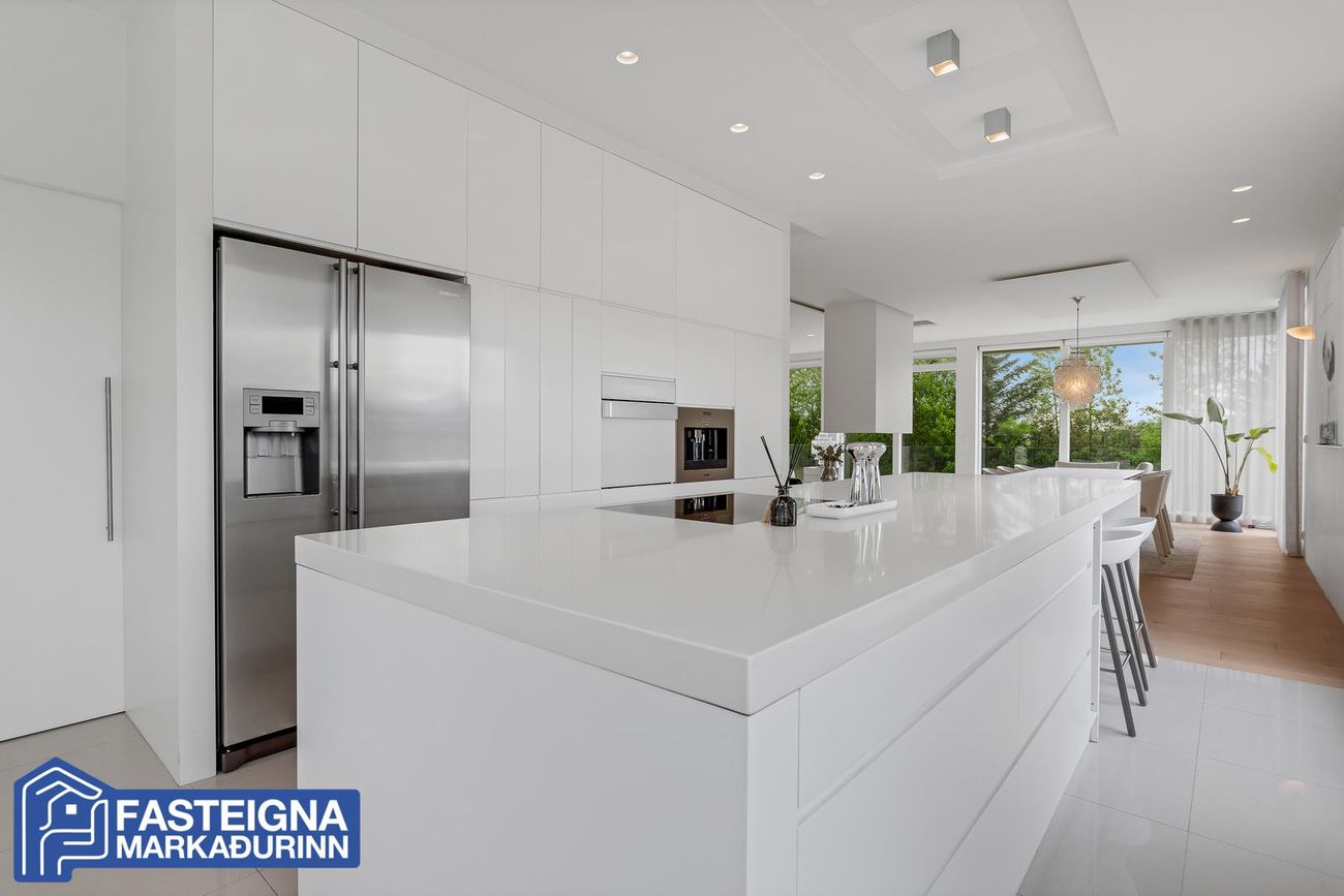 Tveggja hæða einbýlishús með sérsmíðaðri innréttingu, aukinni lofthæð og gólfhitakerfi. Skiptist í stórar stofur, eldhús með eyju, búr, þvottaherbergi og fjölmargar veröndir/svalir.