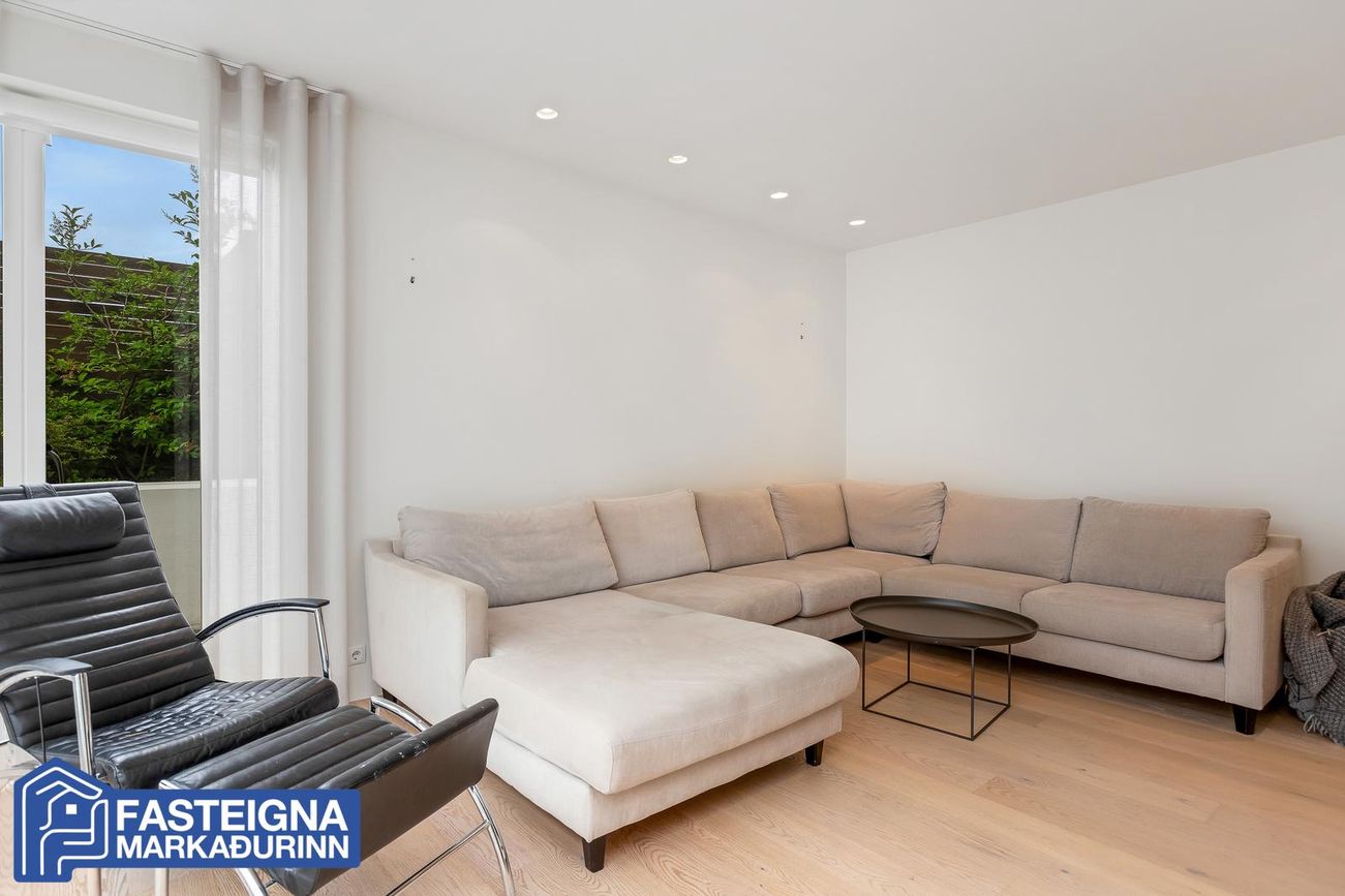 79,6 fermetra þaksvalir með útsýni, 17,6 fermetra austursvalir og skjólsæl suðurverönd.