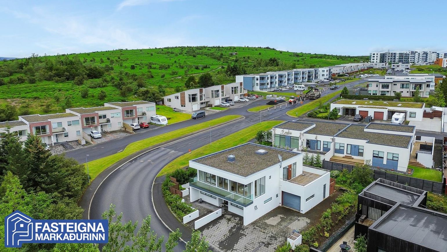 Fullfrágengin lóð með hellulagðri innkeyrslu, stéttum með hitalögnum og stórum harðviðarverönd.