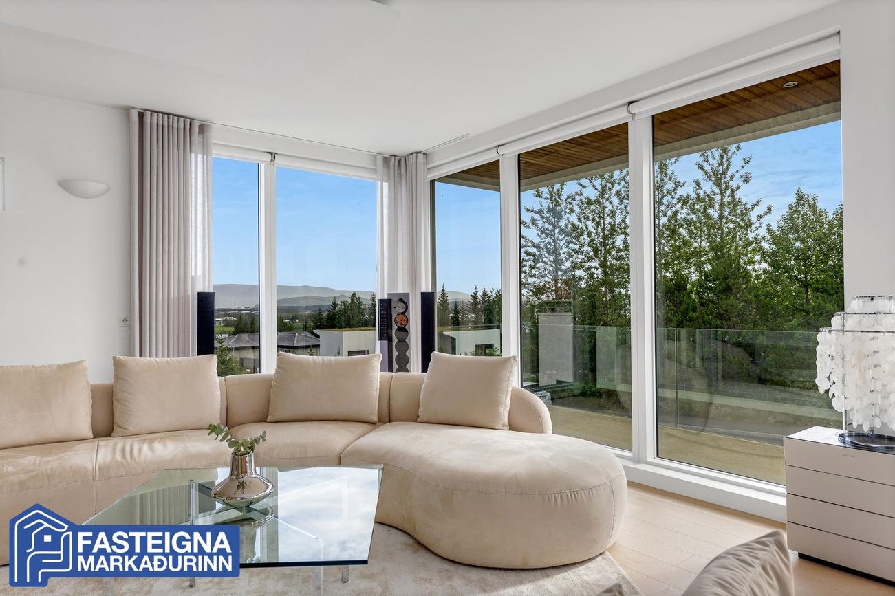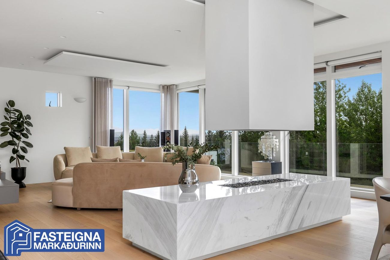 Stórar, parketlagðar stofur með gólfsíðum gluggum, rafstýrðum gardínum og marmaraklæddum gasarinn.