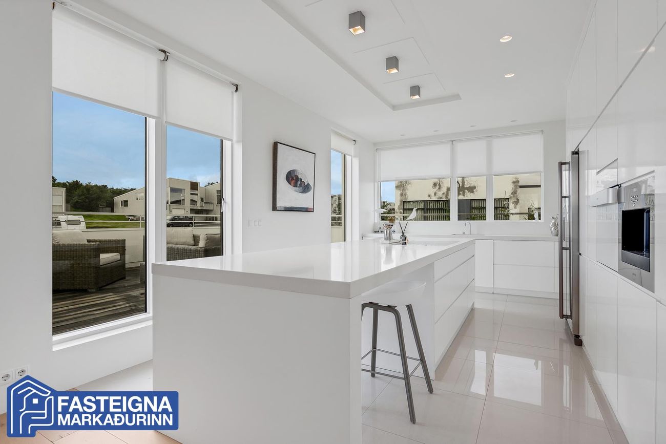 Vandað eldhús með kvartssteinsborði, innbyggðri uppþvottavél og kaffivél, stórri eyju og útgengi á þaksvali.