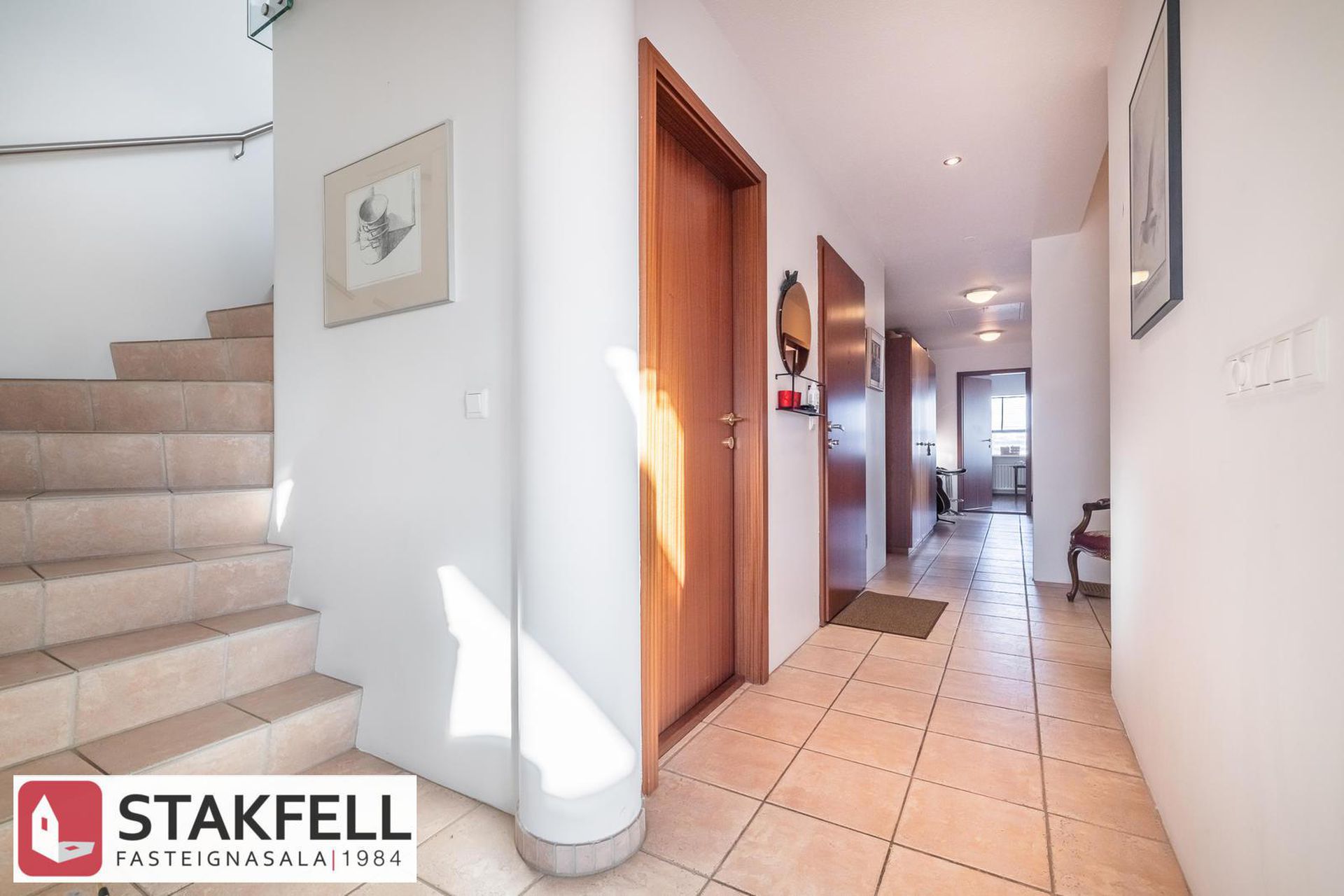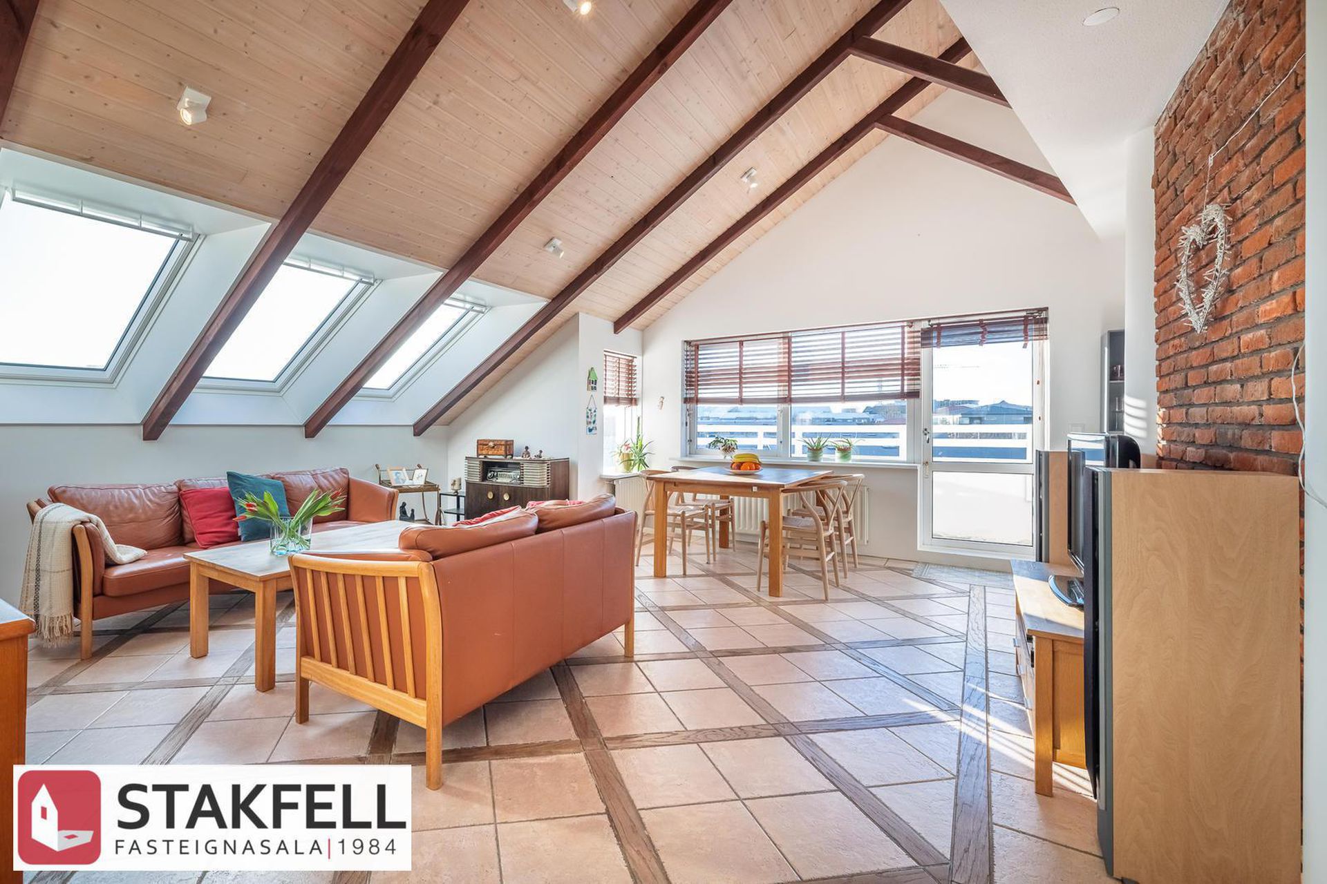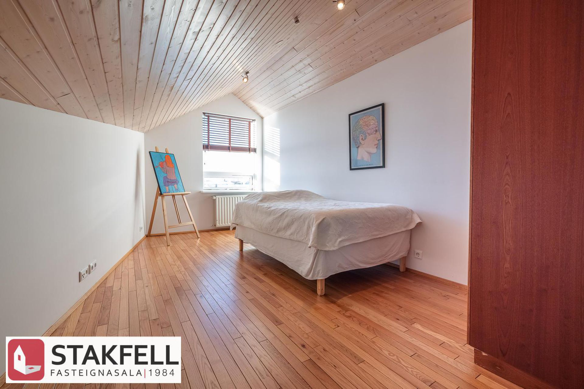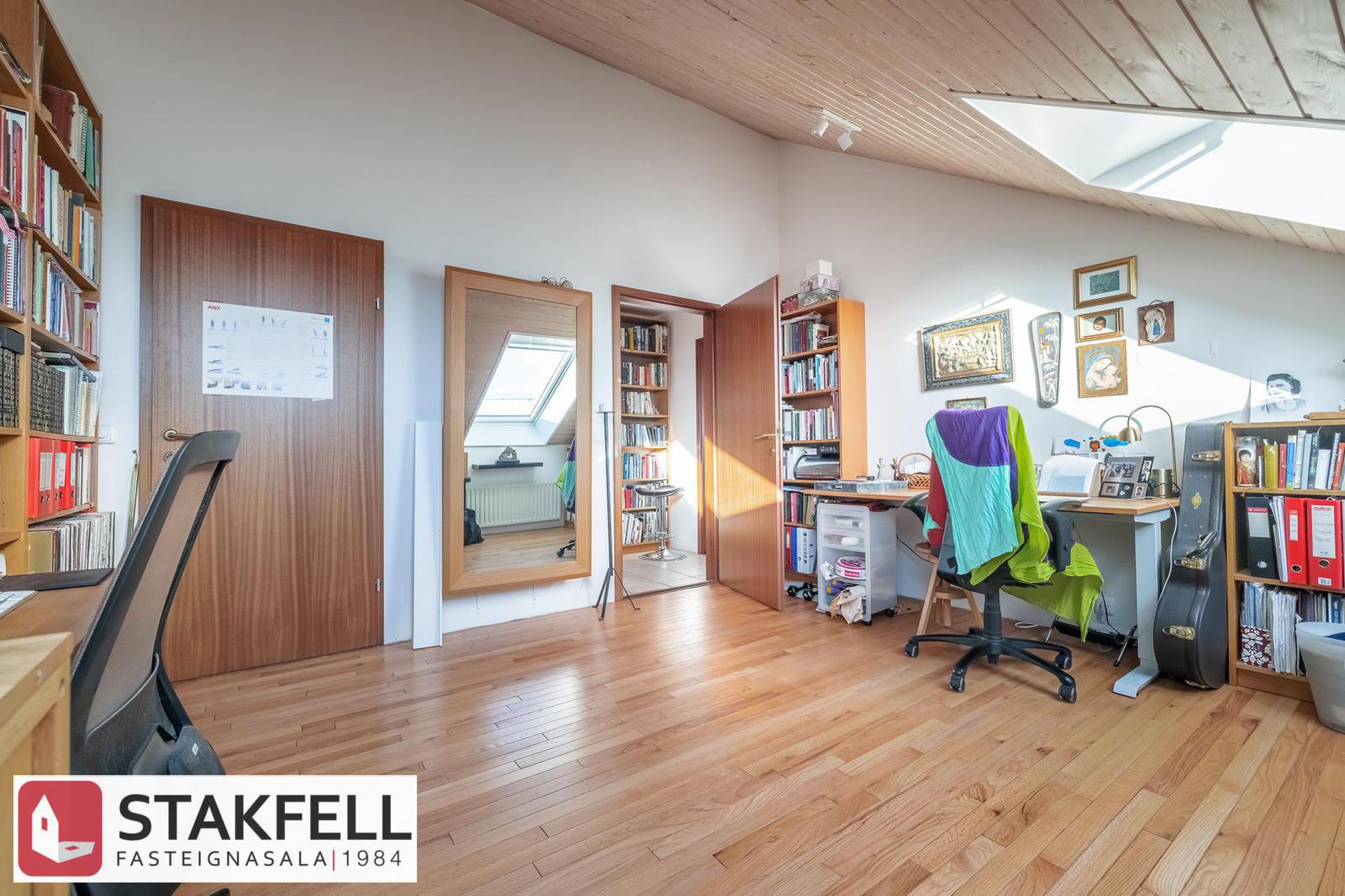STAKFELL S: 535-1000 kynnir í einkasölu: Einstakalega fallega og vel skipulagða 4-5 herbergja útsýnis íbúð á 7. hæð (efsta hæð) við Gullsmára 8, 201 Kópavogi. Glæsilegt útsýni!Nánari upplýsingar gefa Erling Proppé S: 690-1300, og Hafþór Örn S: 699-4040, Nánari lýsing: Einstaklega falleg og björt eign á tveimur hæðum í sjö hæða lyftuhúsi á þessum vinsæla og eftirsótta stað í Smárahverfinu í Kópavogi. Mikil loft hæð er í stofu og hjónaberbergi og er hluti íbúðarinnar undir súð, því er nýtanlegur gólfflötur íbúðar stærri en fermertratalan segir til um. Íbúðin skiptist íNeðri hæð: Hol, tvö stór svefnherbergi, stofu, eldhús, baðhergi, þvottahús, tvennar svalir og geymslu sem er innan íbúðar. Efri hæð: Hol og rúmgott herbergi.Samkvæmt FMR er íbúðin 119,1fm og geymsla 12,7fm. Samtals: 131,8fm.Neðri hæðHol: Komið er í inní rúmgóðan flísalagðan gang sem tengir saman öll rými íbúðarinnar. gott skápapláss Eldhús: Flíslagt með fallegri innréttingu, gaseldavélStofa: Björt og rúmgóð stofa með flísum á gólfi, mikil lofthæð, útgengi á suðvestur svalir sem eru með glæsilegu útsýni. Lýsing í stofu frá Lumex.Svefnherbergi I: Stórt með gegnheilu parketi. Lýsing frá Lumex. Það er auðvelt að breyta því í tvö herbergi með því að setja upp vegg, eins og upphaflegar teikningar sýna.Hjónaherbergi: Rúmgott með gegnheilu parketi á gólfi og góðum skápum, mikil lofthæð, útgengi í norðaustur svalir.Baðherbergi: Flísalagt með hornbaðkari einnig lokaðri sturtu. Falleg innrétting og skápur. nýlega var hluti blöndunartækja endurnýjaður.Þvottahús: Snyrtilegt flísalagt þvottahús sem er innann íbúðar,tengi fyrir þvottavél og þurrkara.Geymsla: Gott geymsluloft innann íbúðar, 12,7fm.Efri hæð:Gengið er upp flísalagaðan stiga uppá á efri hæðina og komið í fallegt bjart hol sem er með gegnheilu parketi og þakglugga. Lýsing frá Lumex.Svefnherbergi II: Rúmgott svefnherbergi sem er parketlagt með gegnheilu parketi, fataskápur er í herberginu.Hjóla og Vagnageymsla: Er í sameign.Nýlegar framkvæmdir: Skipt var um alla þakglugga í íbúðinni og einnig gler í svalahurðinni sem er í stofunni.Allar nánari upplýsingar veitum við fúslega,Erling Proppé, Aðstoðarmaður Fasteignasala S:690-1300, Hafþór Örn, Aðstoðarmaður Fasteignasala S:699-4040, Þorlákur, löggiltur fasteignasali.Kostnaður kaupanda vegna kaupa: Stimpilgjald kaupsamnings einstaklinga er 0,8% og lögaðila 1,6% af fasteignamati eignar. Lántökugjald getur verið breytilegt eftir lánastofnunum, oftast 1%. Þinglýsingargjald er 2.000 fyrir hvert skjal. Þjónustu- og umsýslugjald til fasteignasölu skv. kauptilboði.