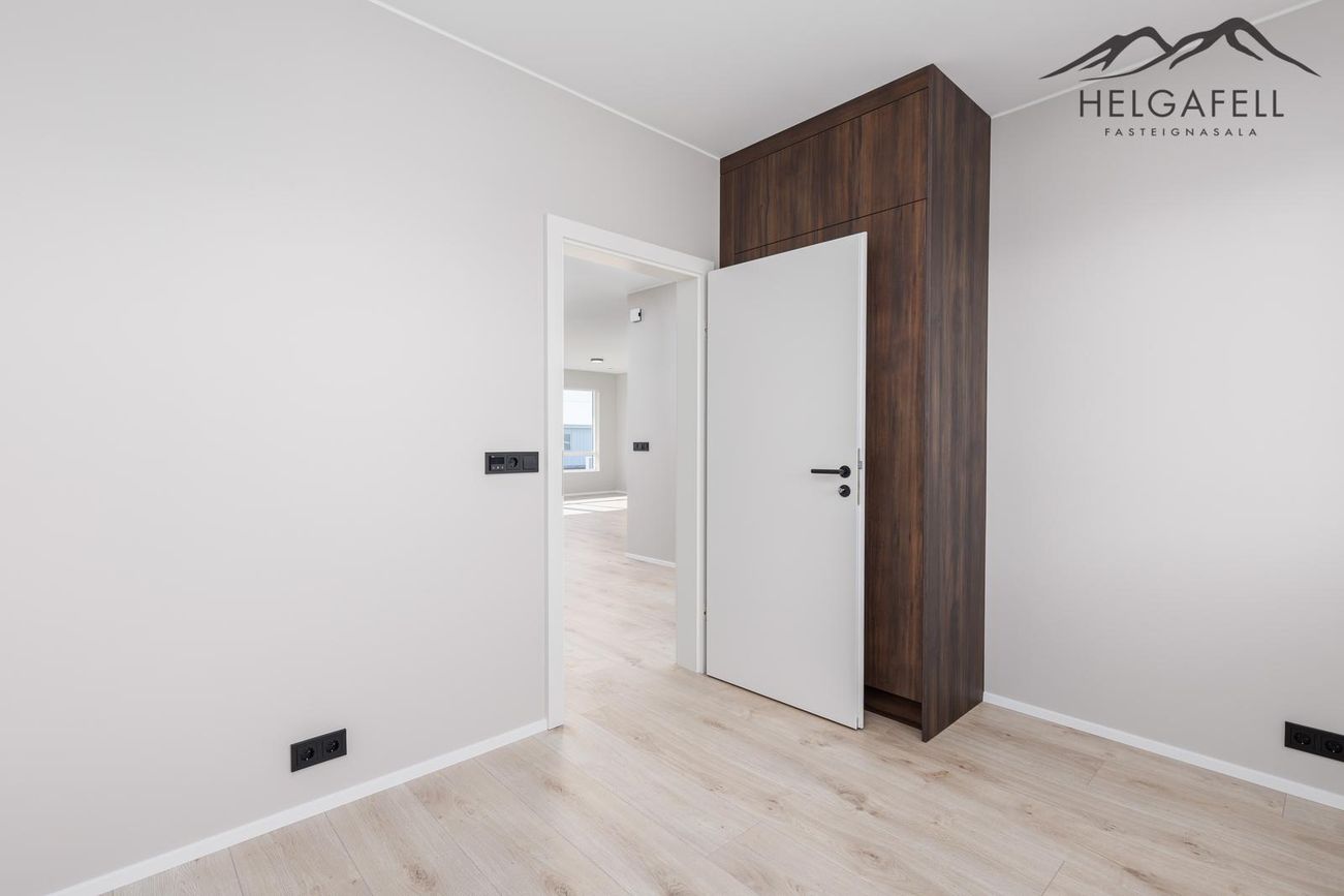 Innihurðir: Hvítar yfirfelldar innihurðir með svörtum hurðarhúnum eru frá Parka. Felliþröskuldar eru á hurðum í anddyri og svefnherbergjum.