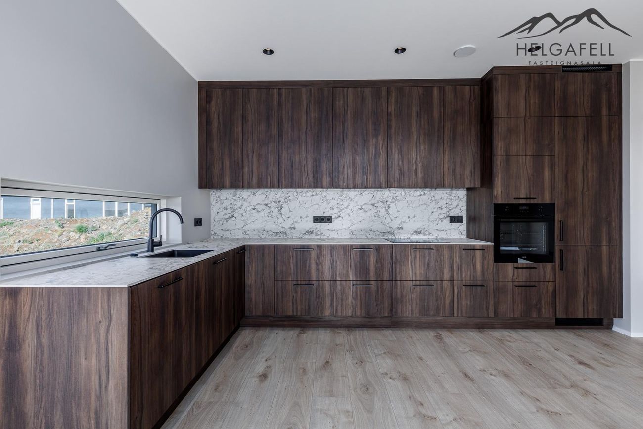 innréttingar: Fallegar brúnar innréttingar eru frá Voke-III, svört handföng og hæglokur. Allar innréttingar eru smíðaðar í fullri lofthæð.