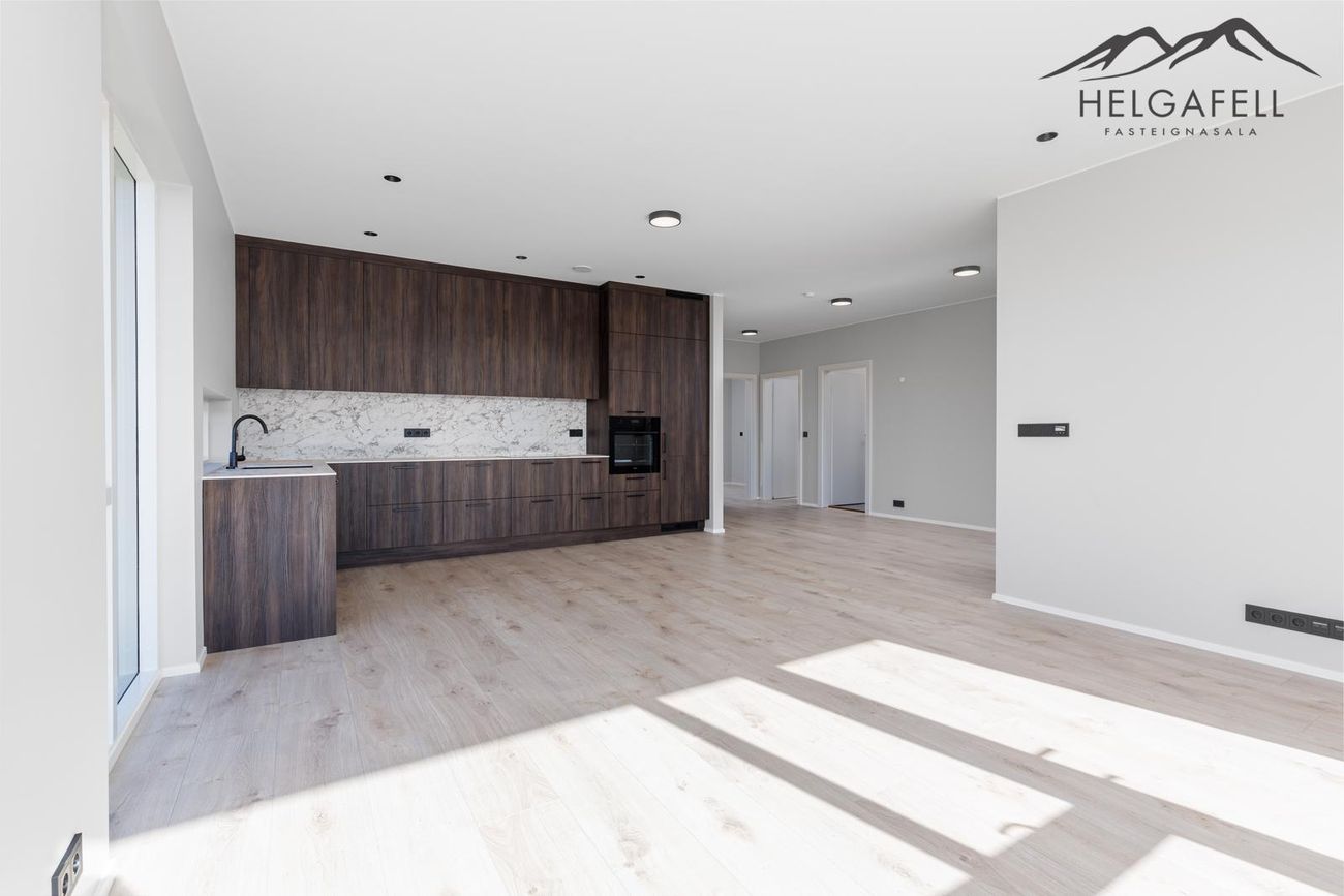Eldhús: Í alrými er rúmgott eldhús með fallegri brúnni innréttingu frá Voke-III með harðpressaðri CLW borðplötu og sama plata er á vegg milli skápa, innbyggður ísskápur og uppþvottavél, bakstursofn í vinnuhæð, undirfelldur vaskur, spanhelluborð og vifta, innfelld lýsing neðan á efri skápum, innfelld lýsing, parket á gólfi.