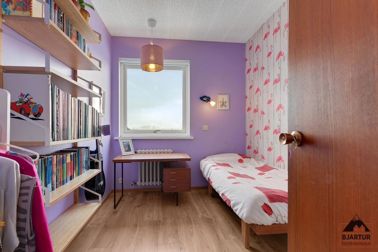 Þrjú svefnherbergi, hjónaherbergi með innbyggðum skáp og sérstöku fataherbergi, tvö barnaherbergi, annað mjög rúmgott.
