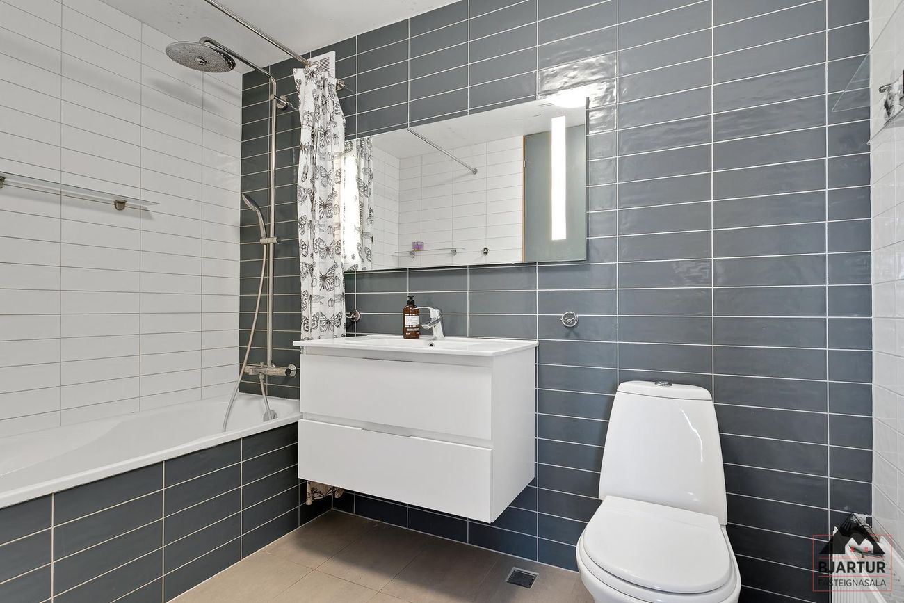 Baðherbergi með baðkari með sturtu og upphengdu salerni. Flísalagt í hólf og gólf.
