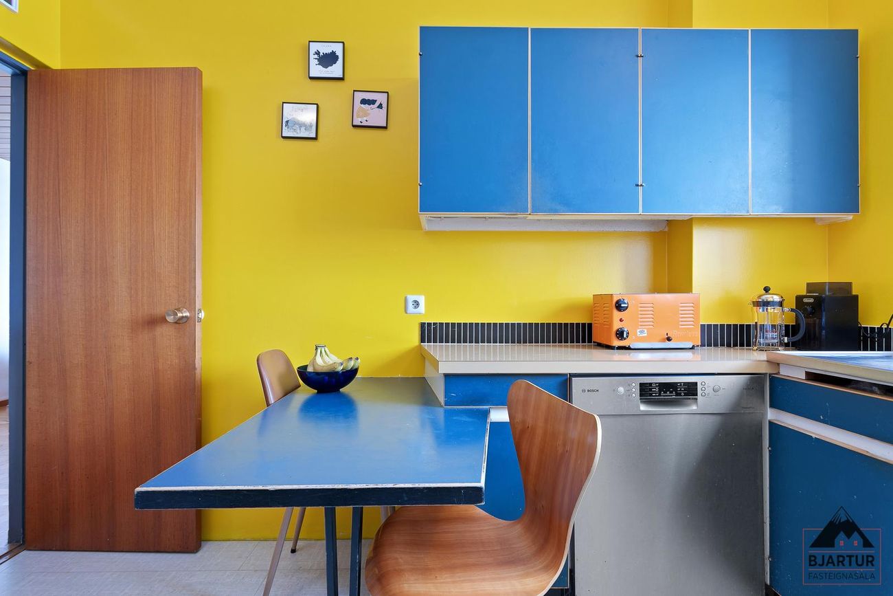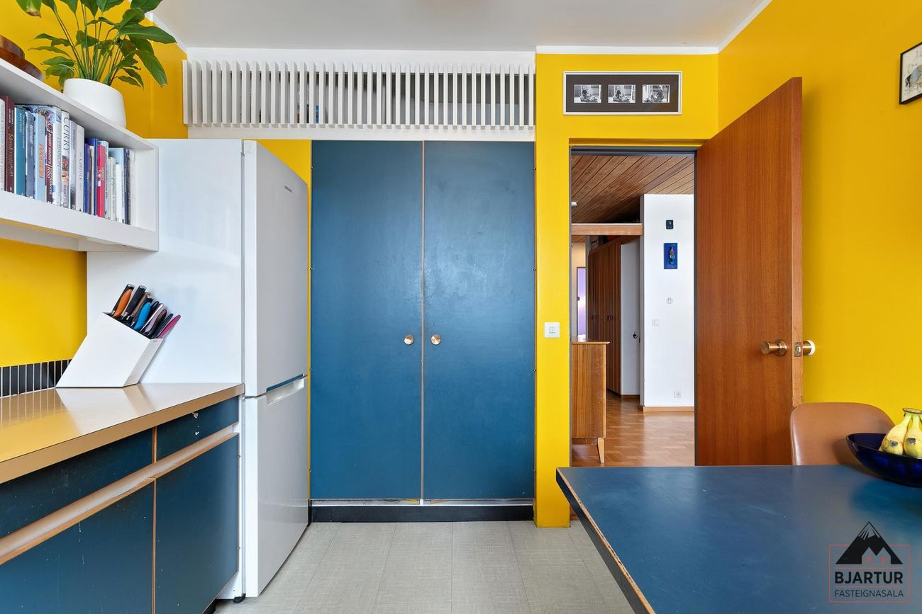 Eldhús er með upprunalegri innréttingu sem var hönnuð af Magga Jónssyni sem var fyrsti eigandi íbúðarinnar, þar er stór gluggi og korkur á gólfi.