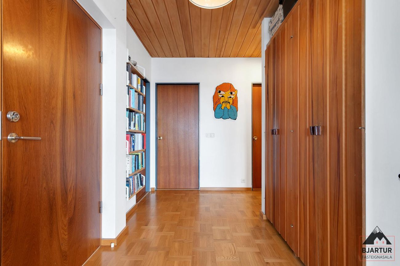 Plastparket á gólfi. Úr öllum svefnherbergjum er óhindrað útsýni yfir Esju, á veturna sést Friðarsúlan og norðurljósin njóta sín.