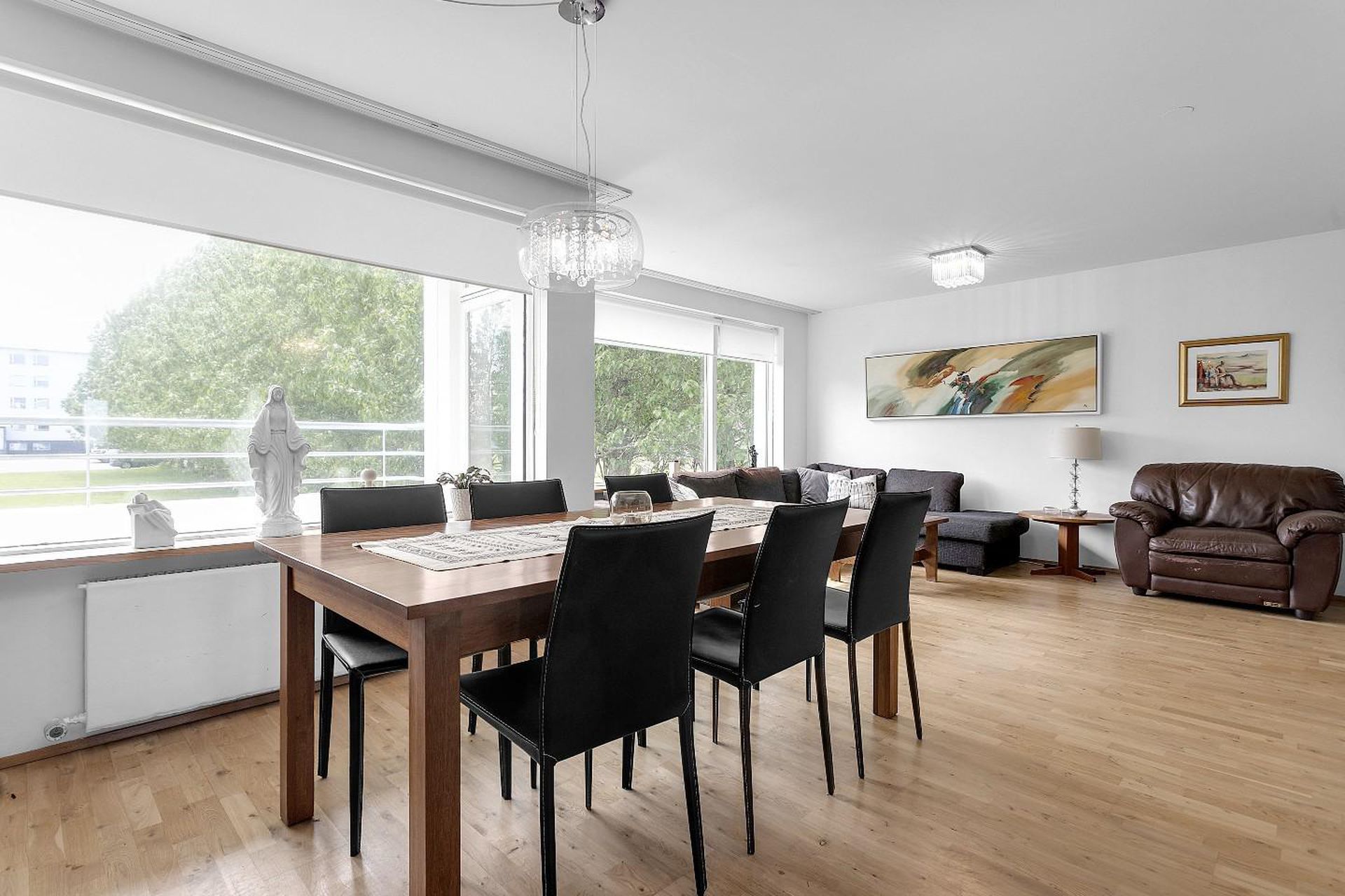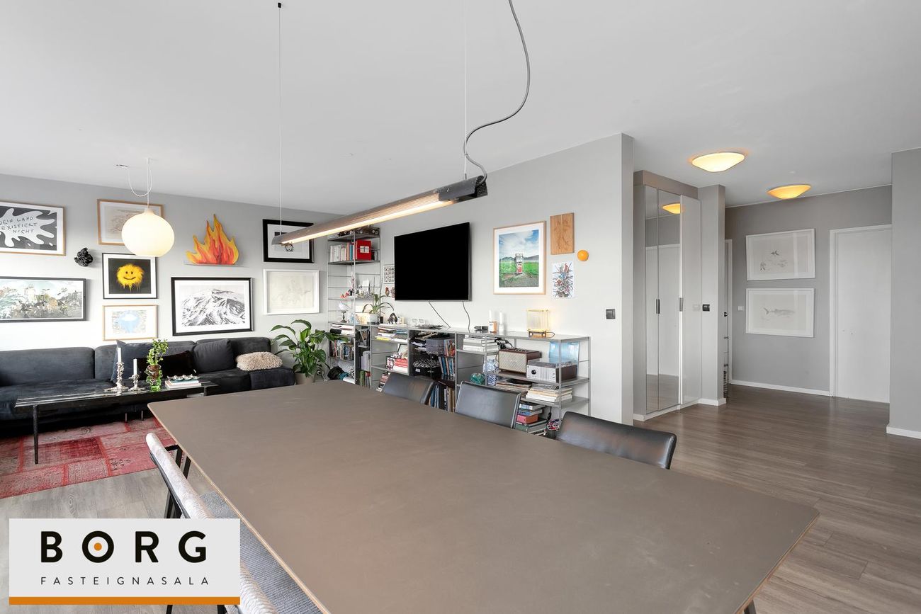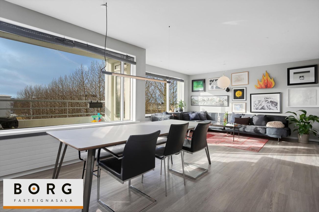 Við inngang tekur á móti forstofa með fataskáp. Þaðan er komið inn í rúmgóða og bjarta stofu og borðstofu þar sem stórir gluggar gefa rýminu góða birtu og fallegt útsýni.