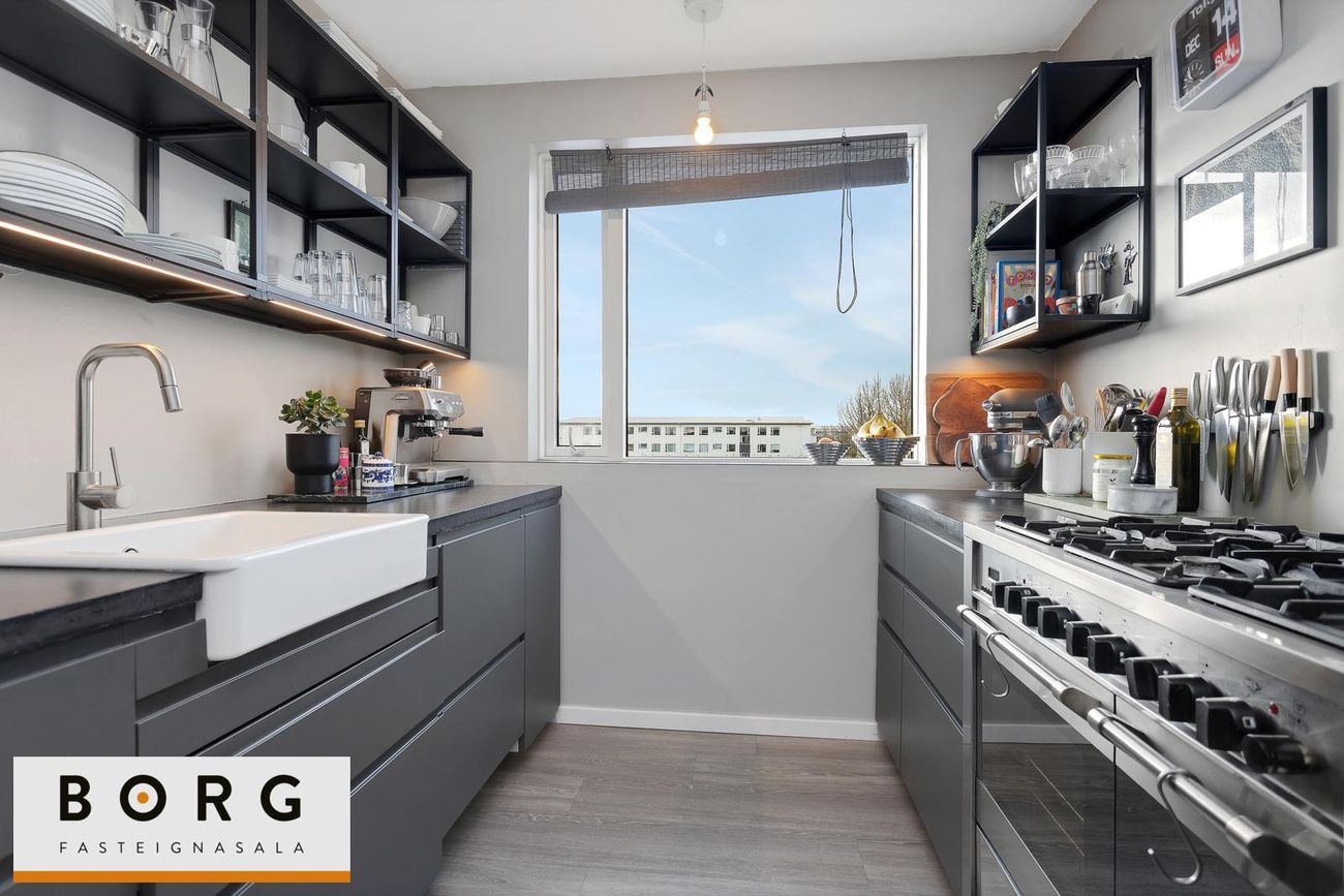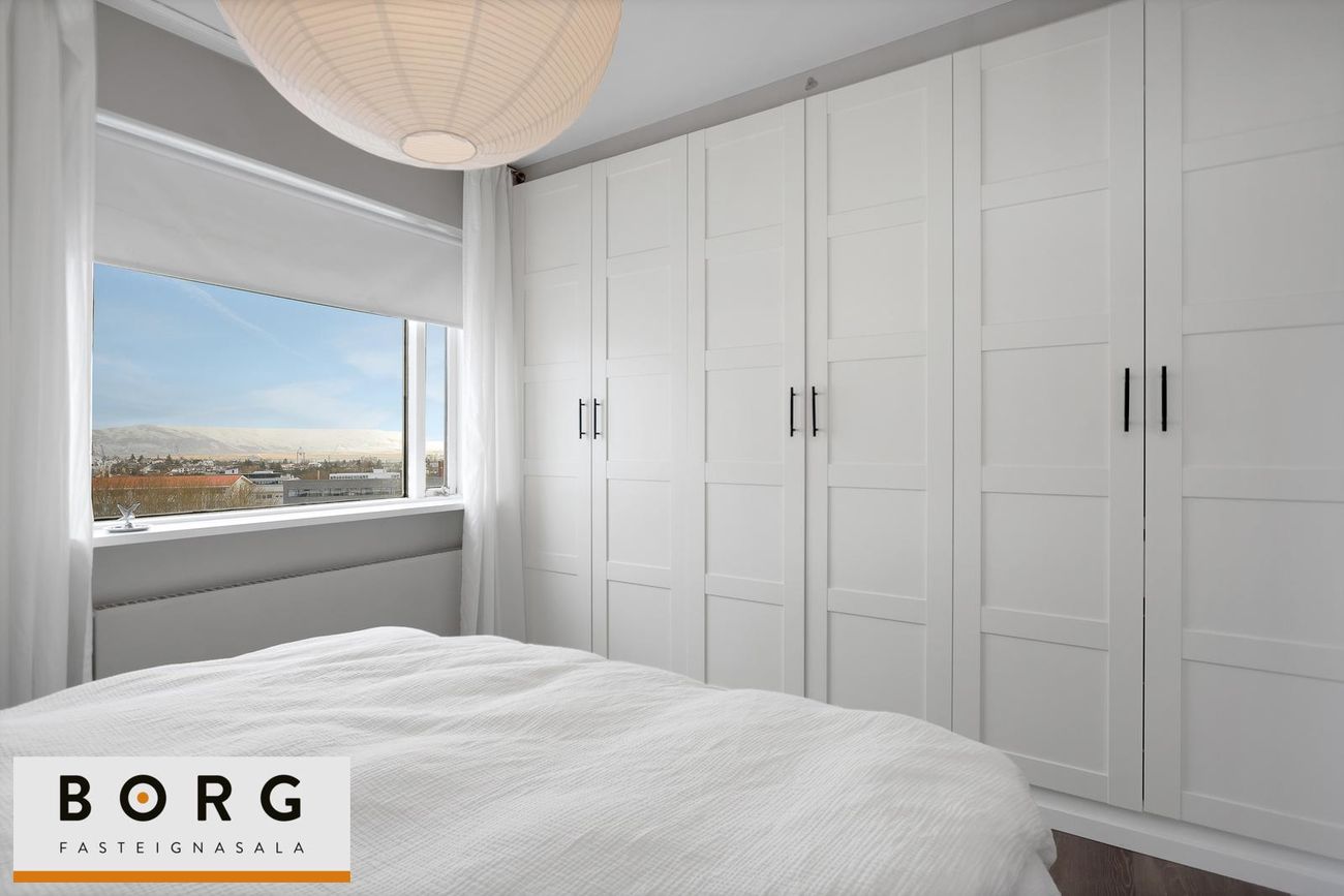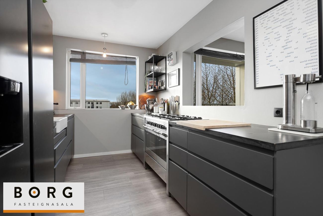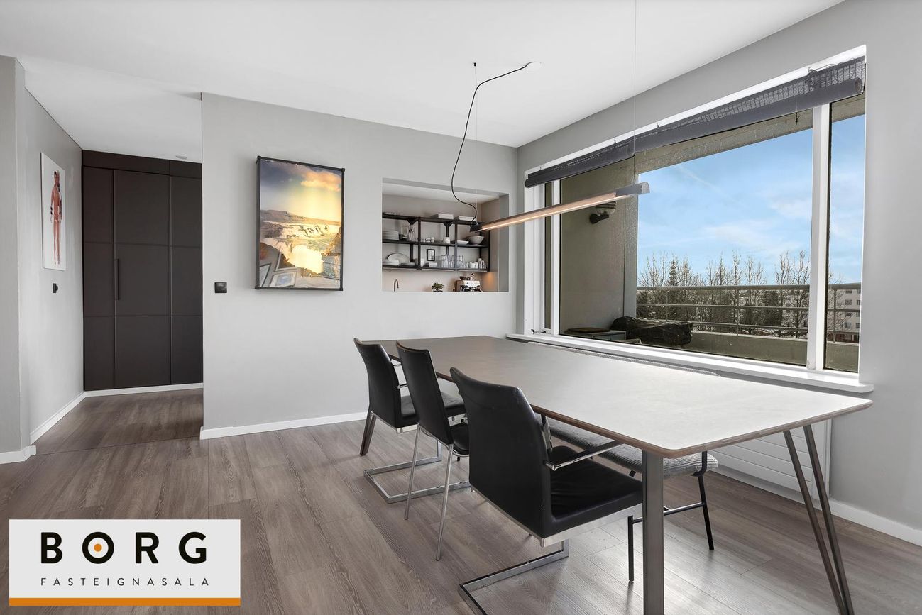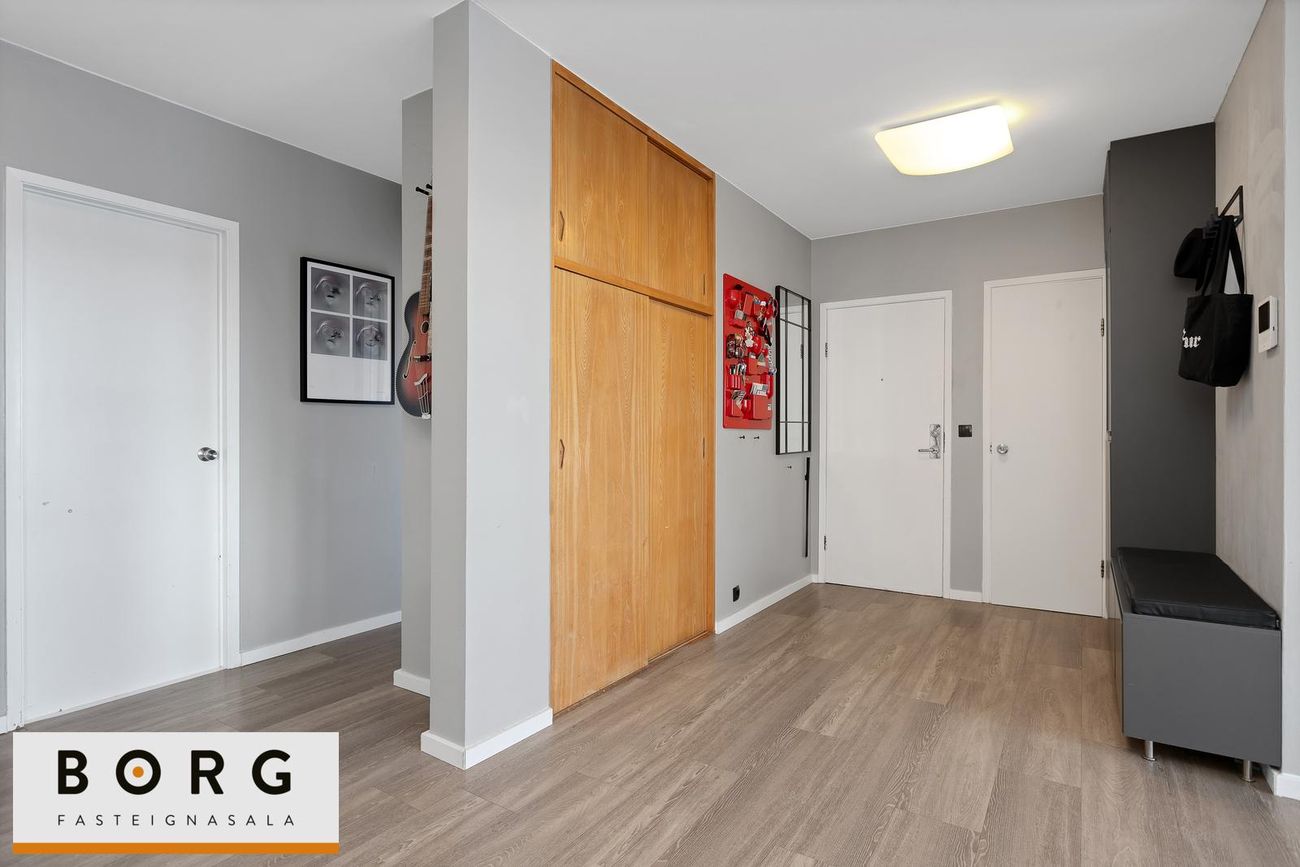 Háaleitisbraut 119 – rúmgóð 5 herbergja íbúð með fjórum svefnherbergjum. Fallegt og mikið útsýni. Tvennar svalir, til vesturs og suðurs. íbúðin sjálf er 128,7 fm og geymsla í kjallara 5,7 fm. Rúmgóð og björt 134,4 fm íbúð á góðum stað við Háaleitisbraut í Reykjavík. Íbúðin er vel skipulögð með fjórum svefnherbergjum, stórri stofu og borðstofu, eldhúsi sem hefur verið opnað að hluta inn í stofu og bæði baðherbergi og gestasnyrtingu. Frá íbúðinni er gott útsýni yfir nærumhverfið.