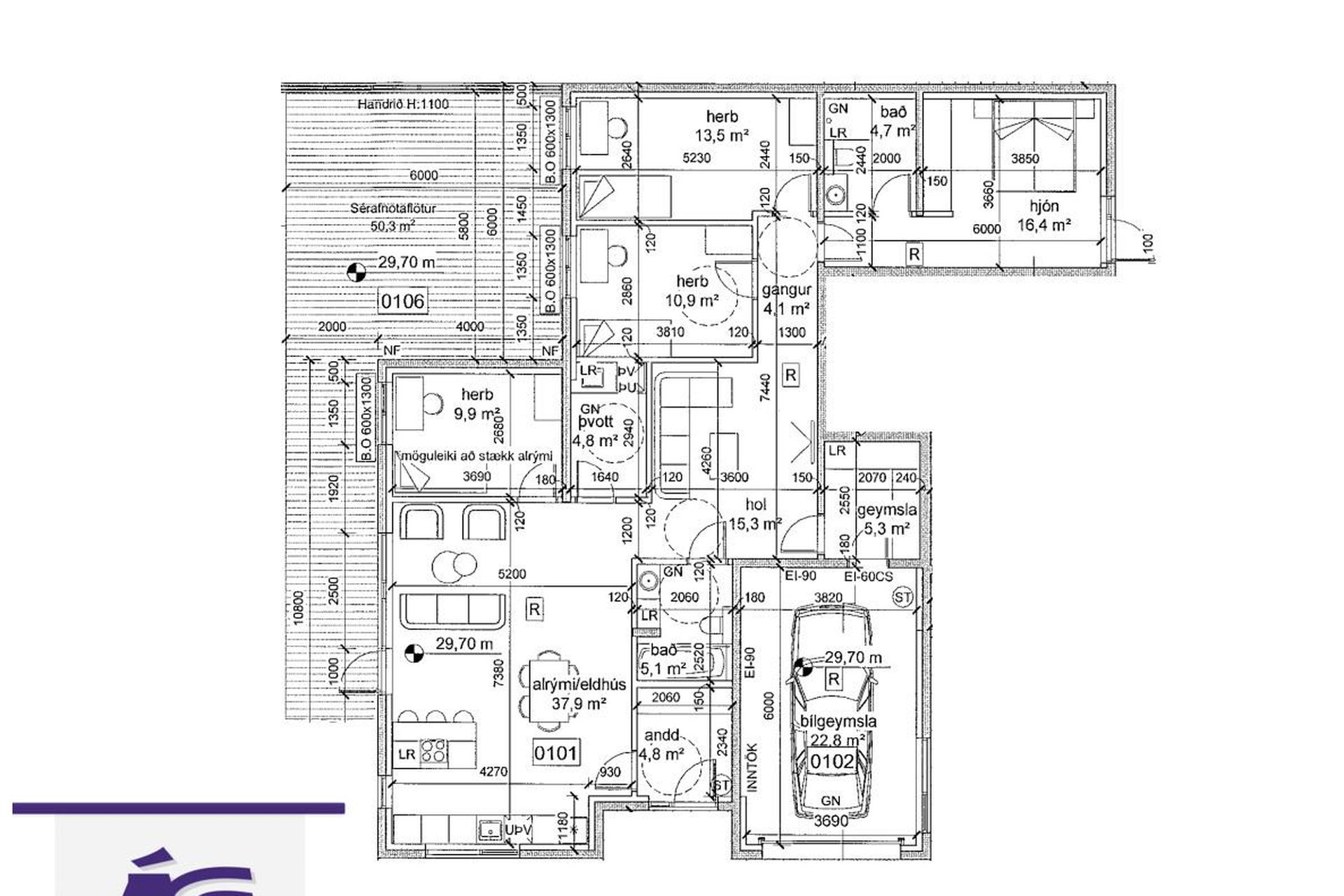 þvottahús.Geymsla og þaðan er innangengt í bílskúrinn. Hann er með heitu og köldu vatni.