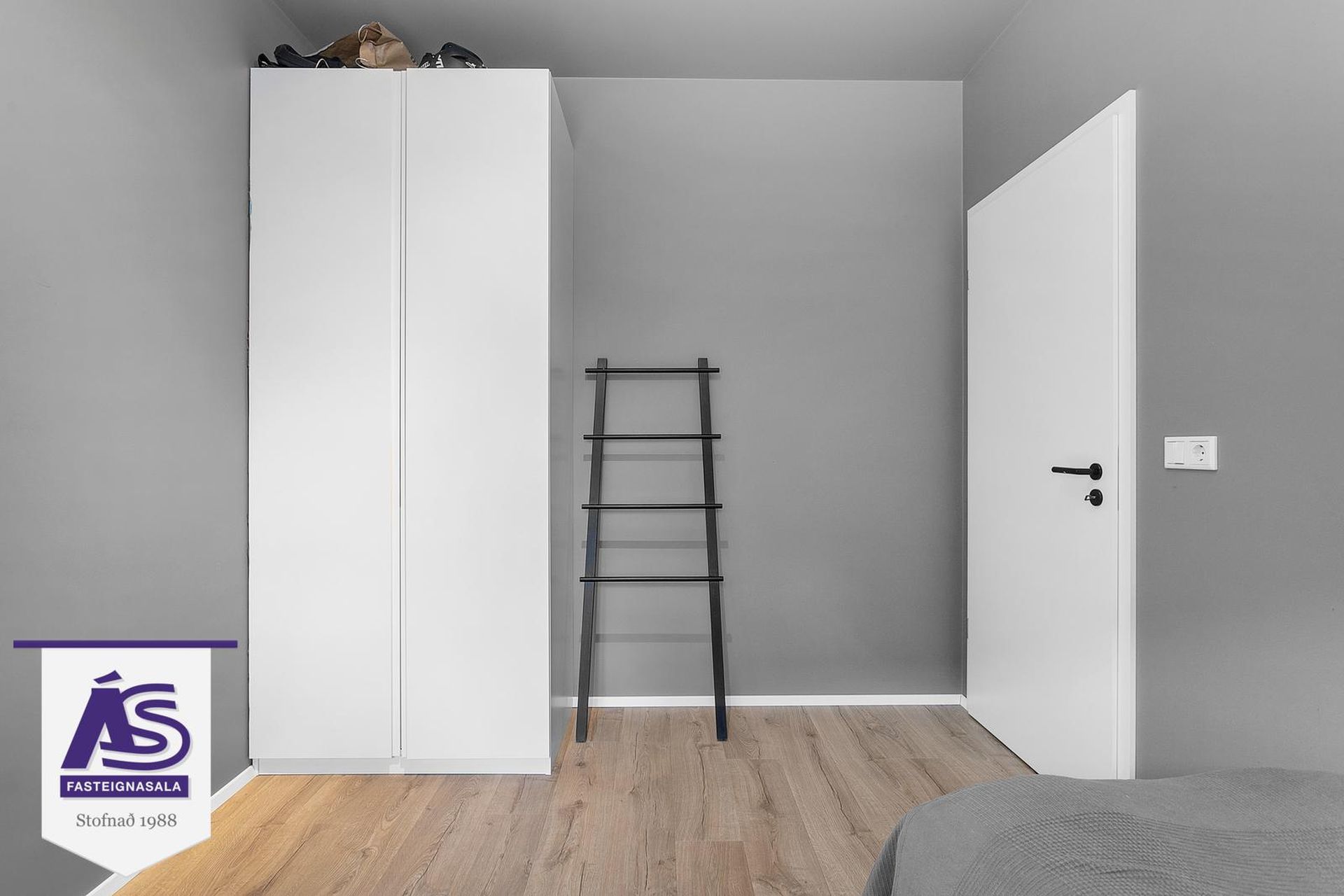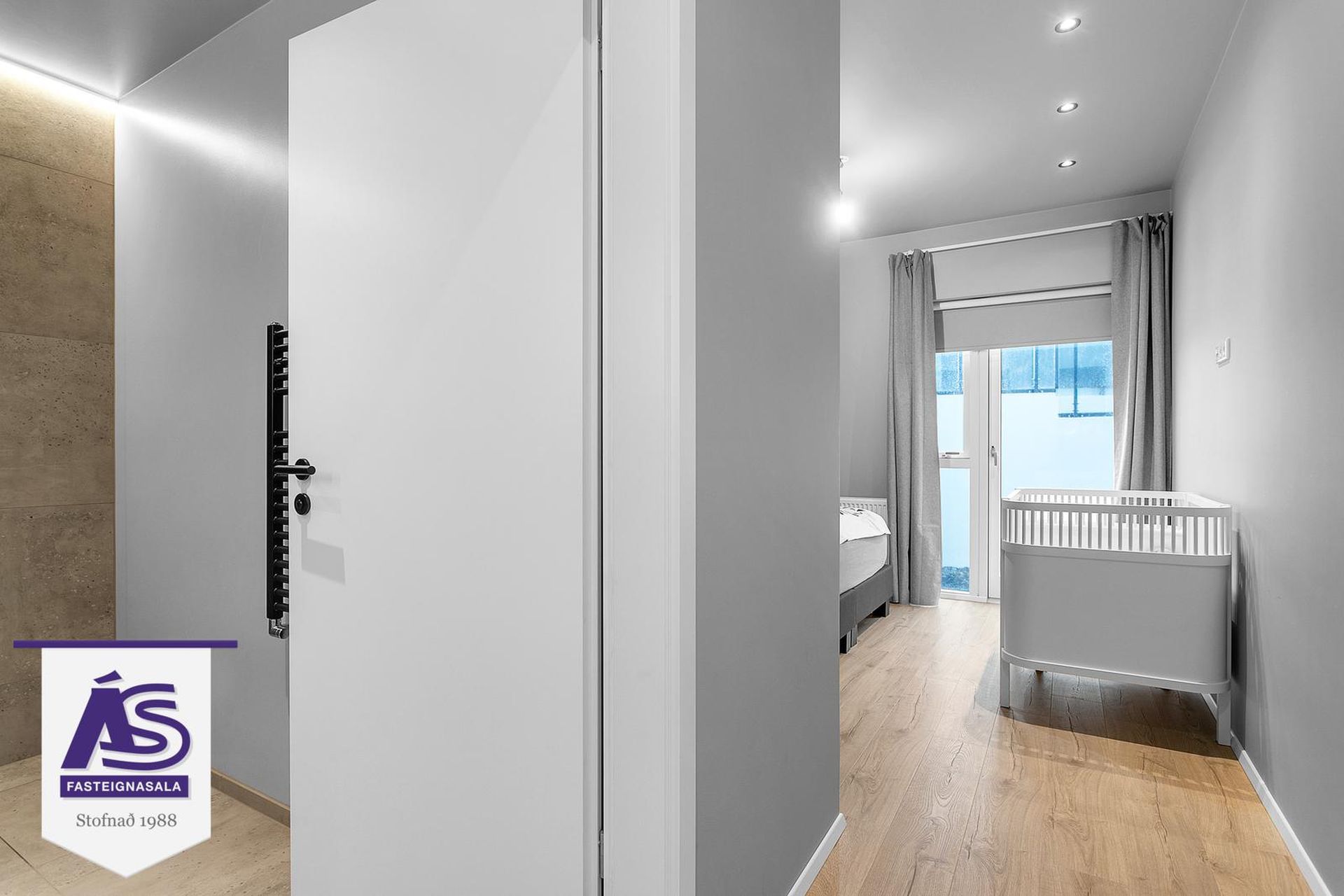 hjónaherbergi með fataskápum. Inn af hjónaherberginu er fallegt flísalagt baðherbergi með innréttingu og handklæðaofn.