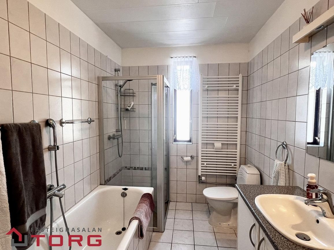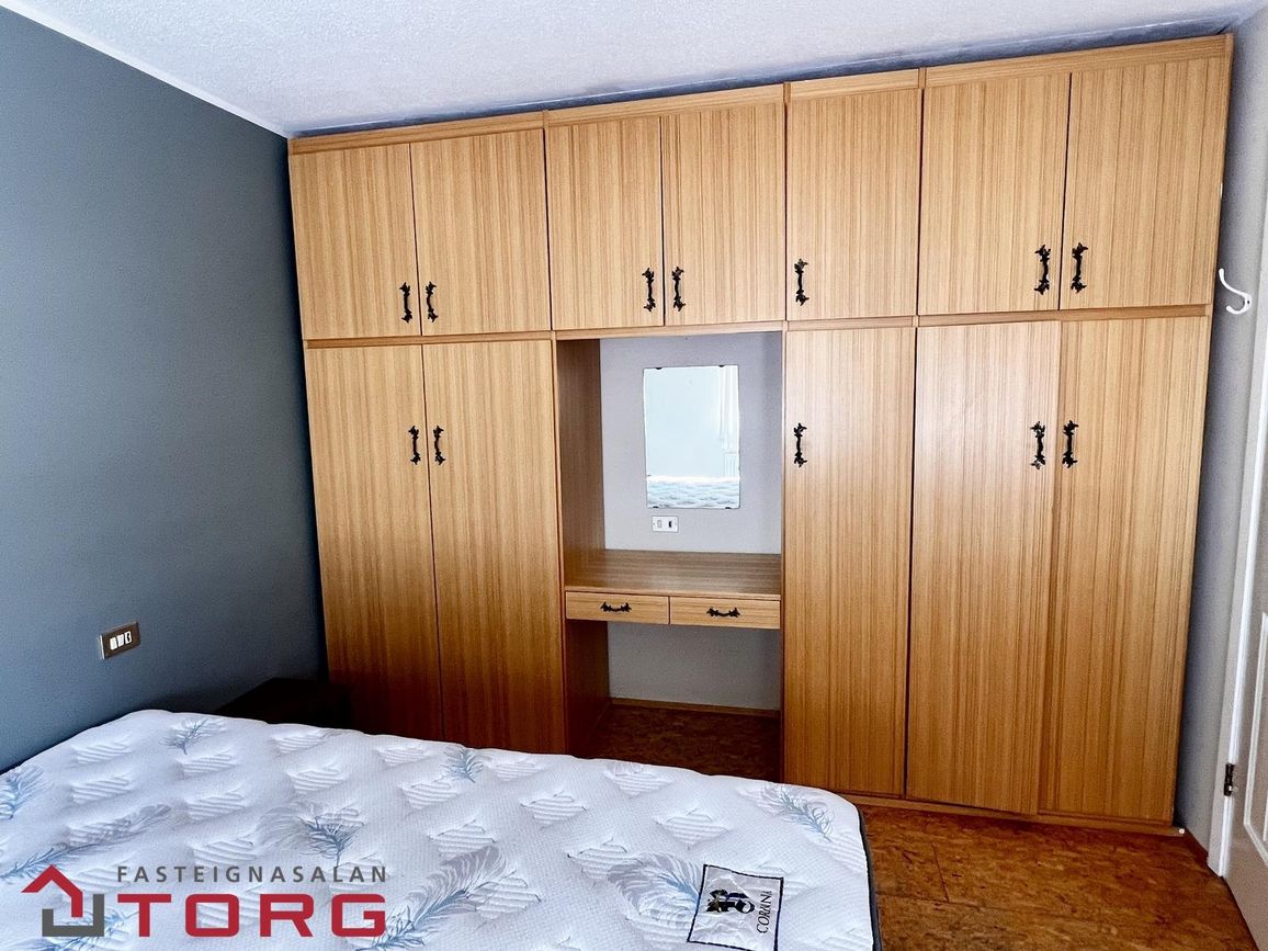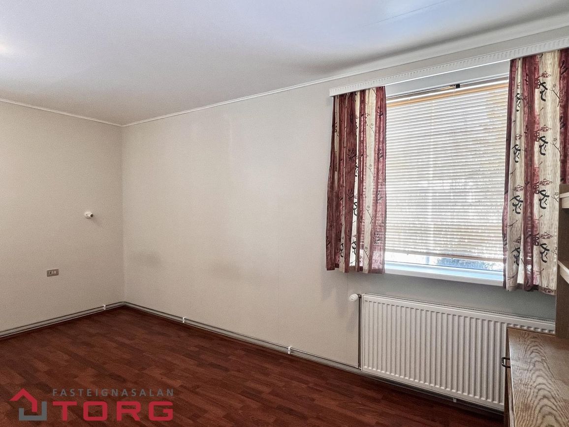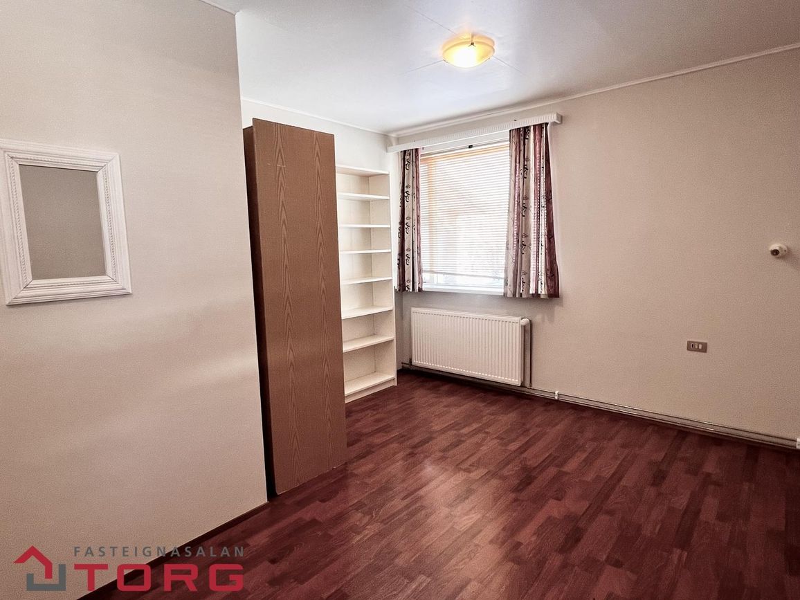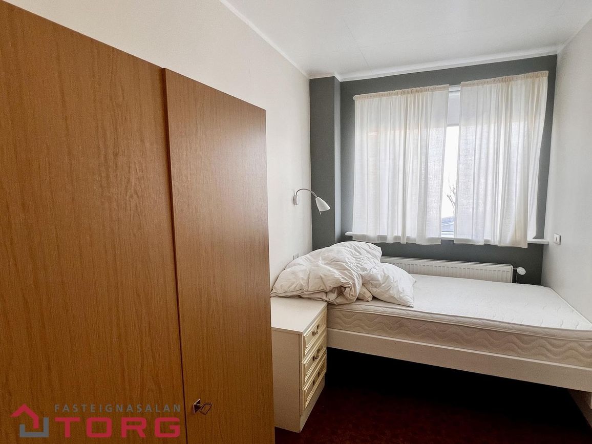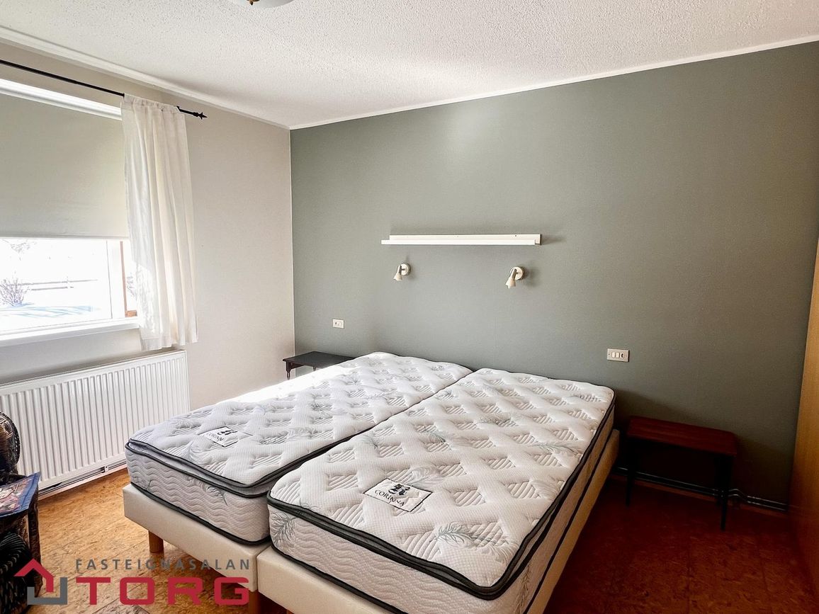 Hjónaherbergi er með góðum skápum. Annað mjög rúmgott herbergi með parketi var upphaflega tvö herbergi, og því er möguleiki á að skipta því aftur upp. Tvær dyr eru inn í herbergið. Tvö önnur góð herbergi eru með dúk á gólfi. Baðherbergið er með baðkari og sturtu, innréttingu og handklæðaofni, flísar eru á gólfi og veggjum. Bílskúrinn er með rafmagni og innst í honum er góð geymsla.