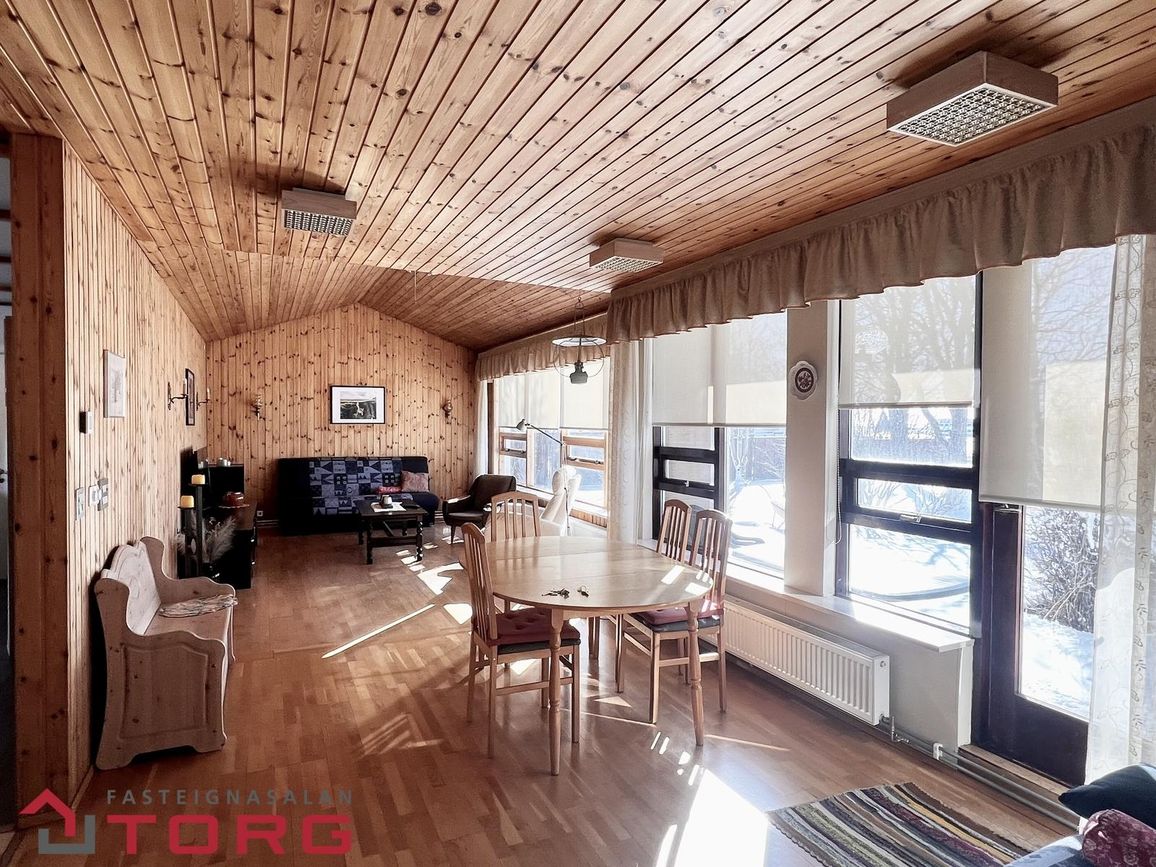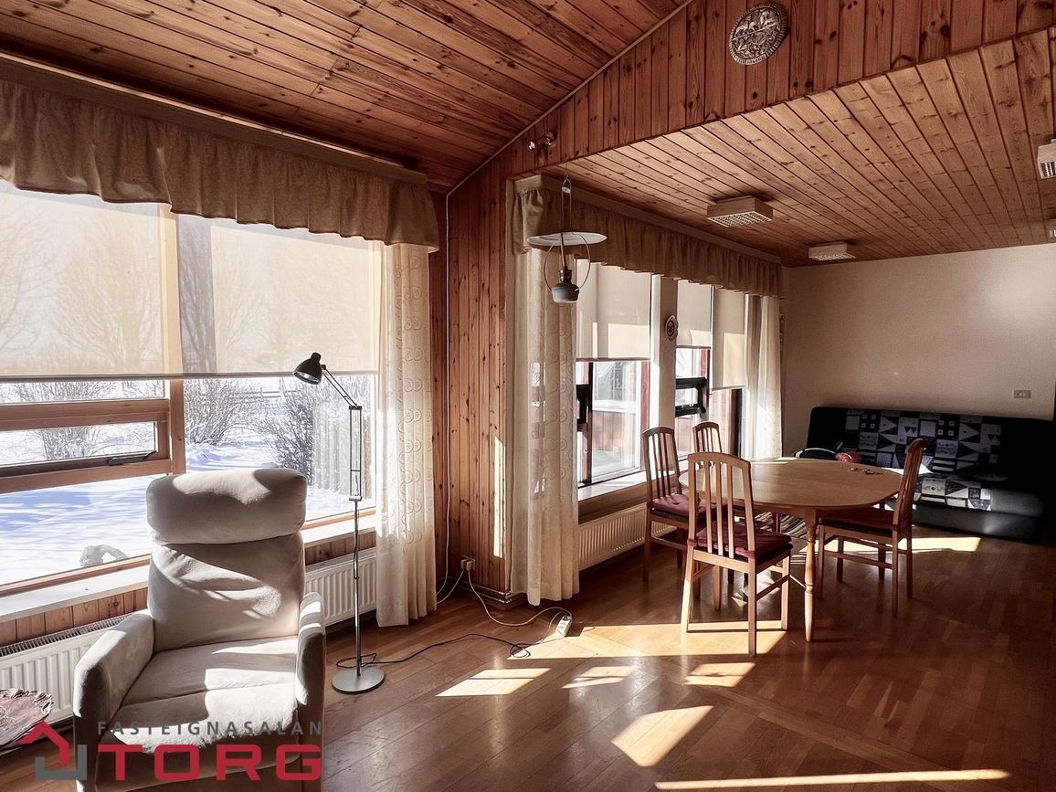 Stofa og borðstofa eru bjartar og rúmgóðar með parketi á gólfi og útgengi út á verönd. Stórir suðurgluggar gefa mikla birtu og bjóða upp á stórkostlegt útsýni yfir jöklana. Svefnherbergisálman samanstendur af fjórum herbergjum og baðherbergi. Gangur er rúmgóður með dúk á gólfi og veggfóðri á veggjum.