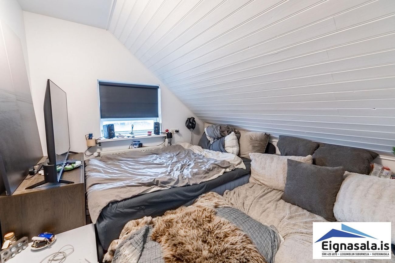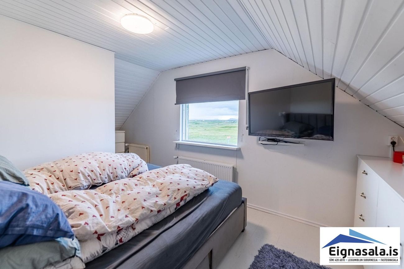 Hjónherbergi með fataherbergi og þrjú minni svefnherbergi á efri hæð. Máluð spónarparket á gólfum.