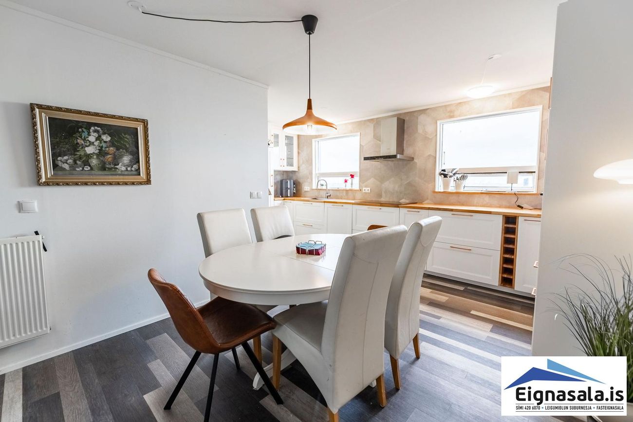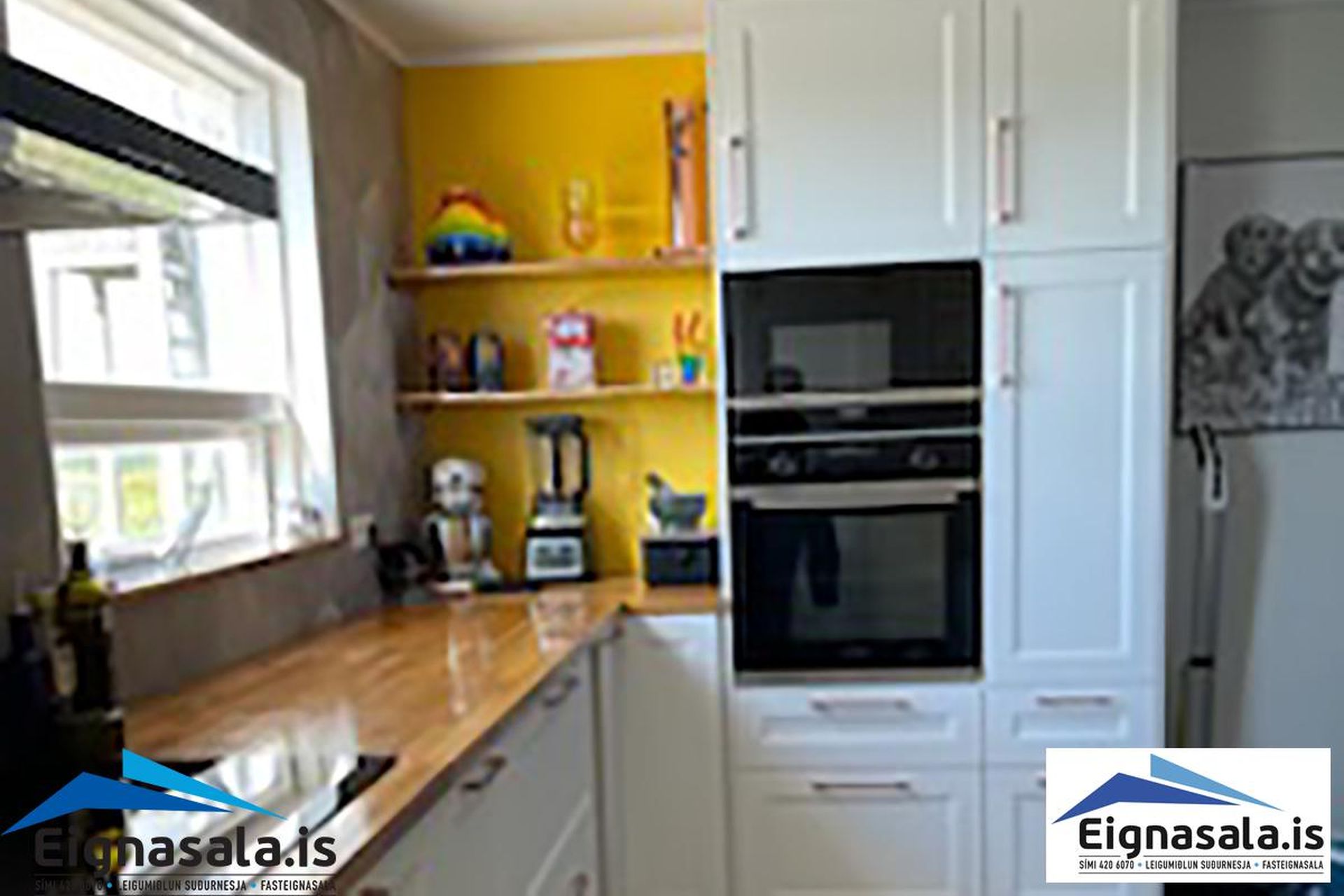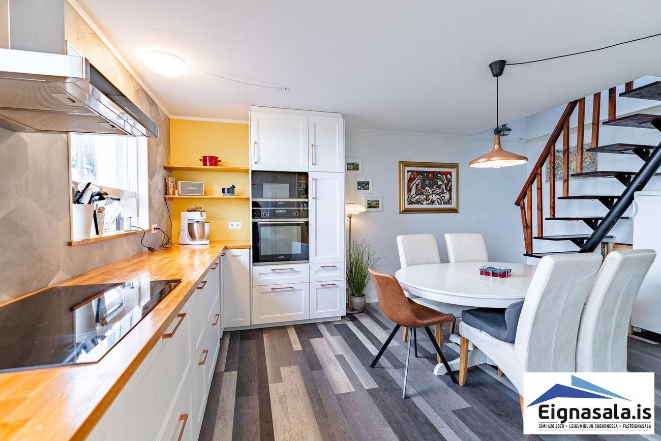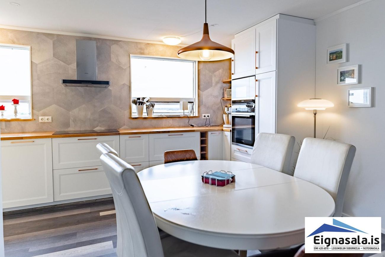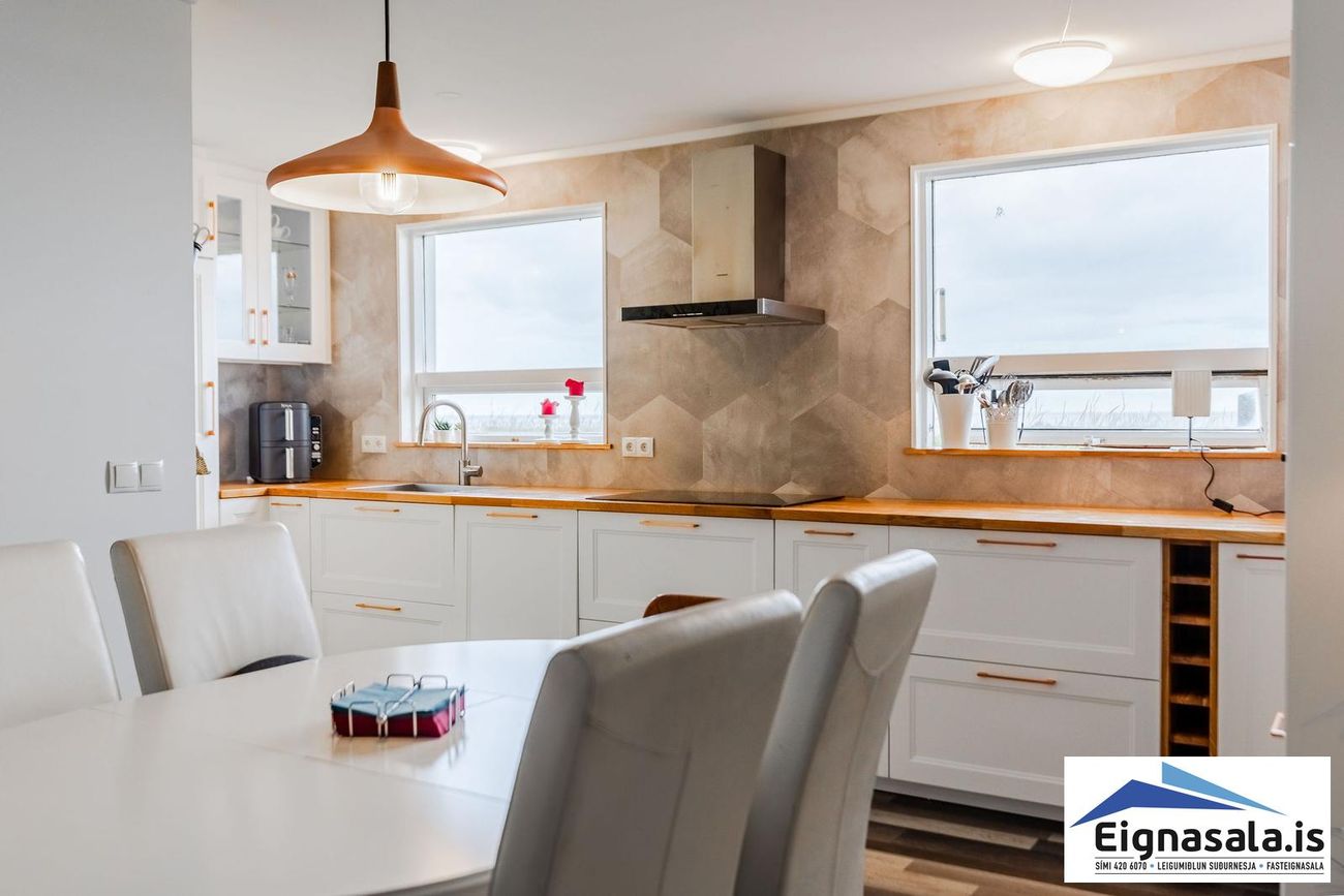 Stórt nýlegt eldhús með hvítum innréttingum, viðarborðplötum og harðparketi. Innbyggður ísskápur, frystir, uppþvottavél, örbylgjuofn, háfur, helluborð og bakarofn.