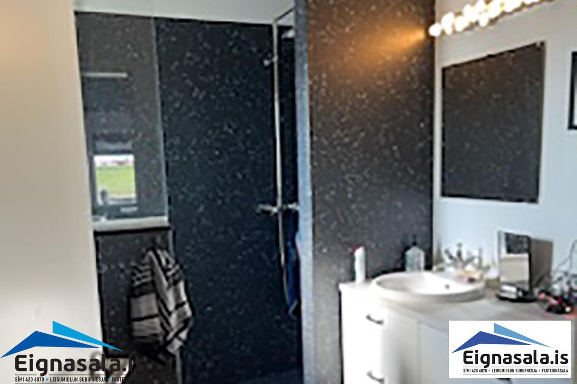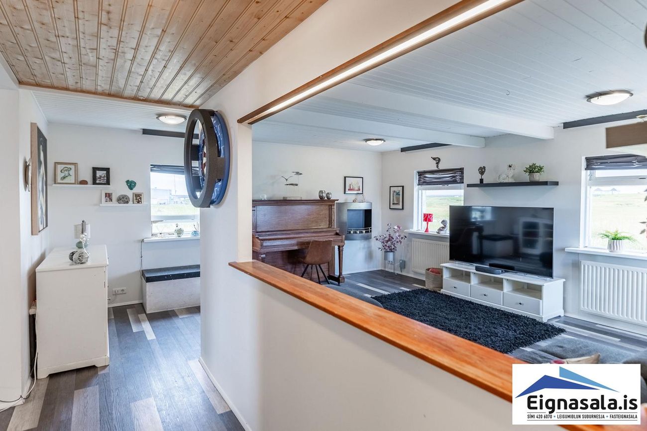 Epoxy í baðherbergi, harðparket í eldhúsi og alrými, spónarparket á efri hæð.