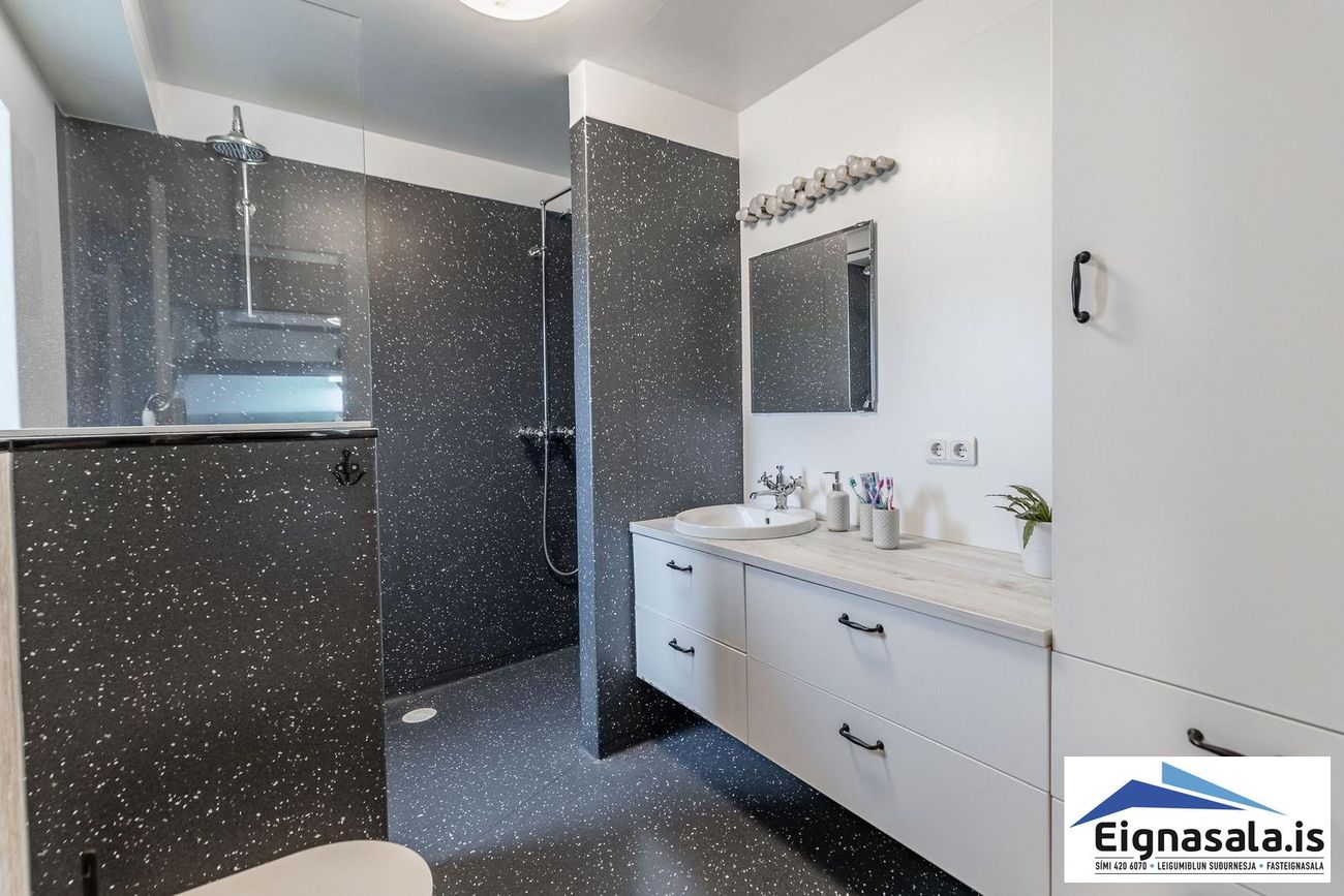 Endurnýjað baðherbergi með tvöfaldri sturtu, epoxy á gólfi og veggjum, vegghengt salerni og nýjum handklæðaofni.