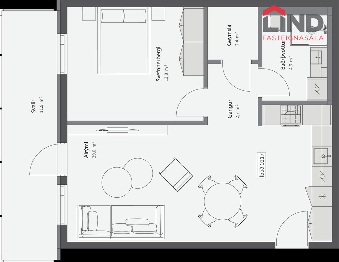 | 2 | 60,20 m² | 61.900.000 kr. 13. febrúar 2025 | 61.250.000 kr. 7. mars 2025 |
