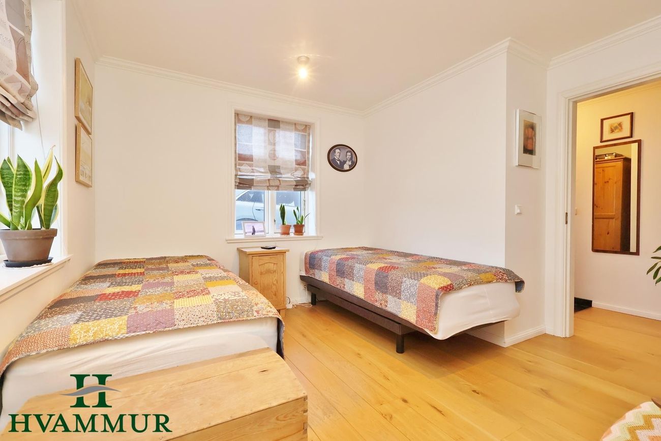 Fjögur svefnherbergi: eitt á neðri hæð og þrjú á efri hæð. Öll með eikarparketi á gólfi.