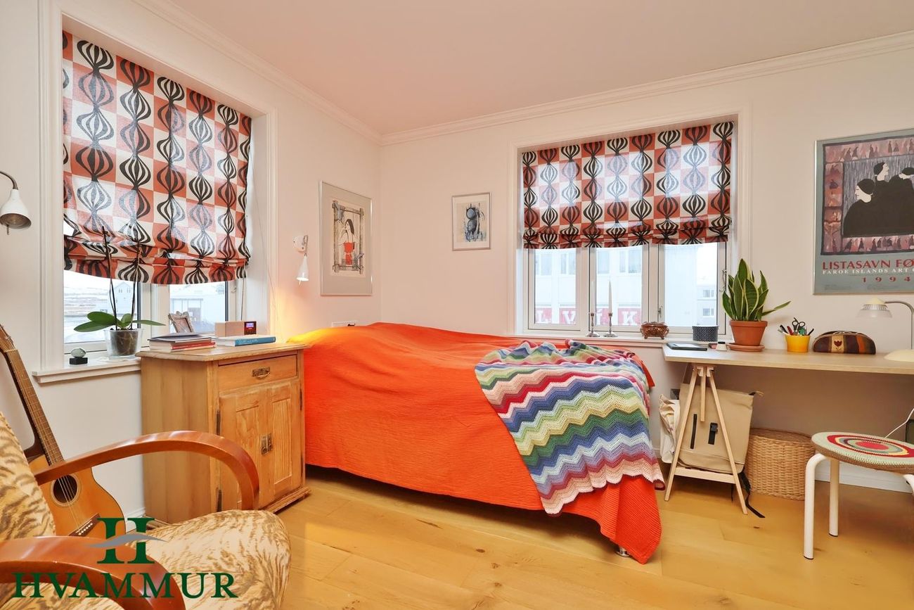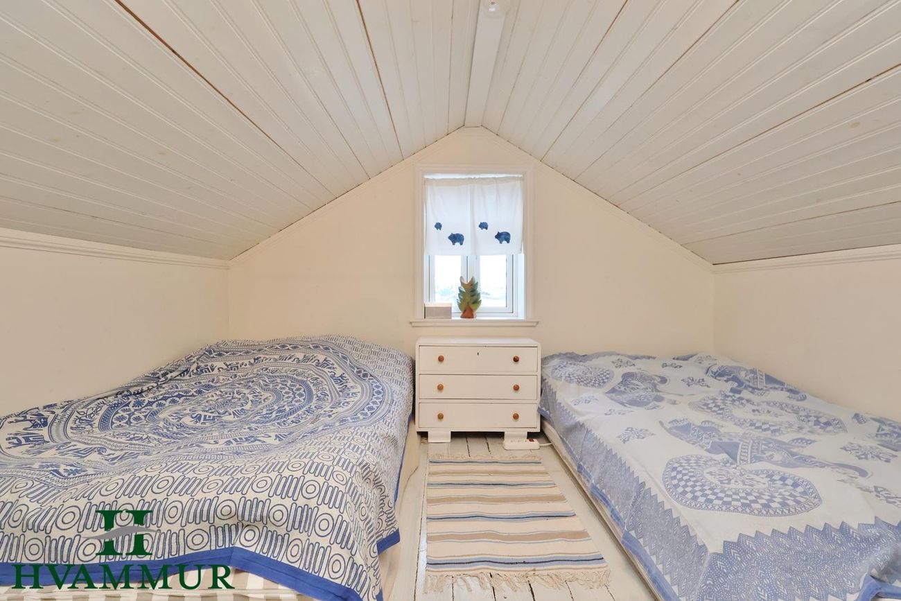 Fataherbergi á efri hæð með veglegum spónlögðum eikaraskápum. Gengt úr fataherbergi í eitt herbergi og baðherbergi. Risið er eitt opið rými (norðurhlutinn stúkaður af sem herbergi) með upprunalegum gólffjölum.