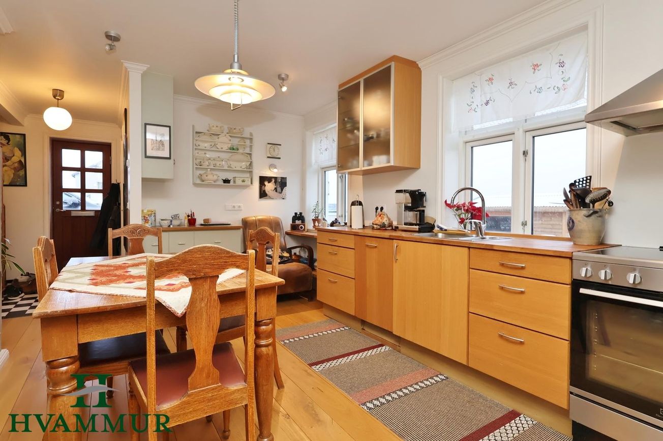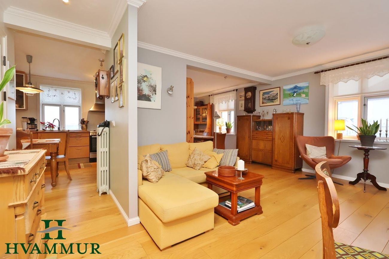 Fallegt og uppgert steypt einbýli. 201,9 m². Skiftist í neðri hæð, efri hæð og ris. Gólfhiti á báðum hæðum. Eikarparket á flestum gólfum. Húsið allt endurnýjað 2007-2008. Skammt frá fjöru með gott sjávarútsýni.