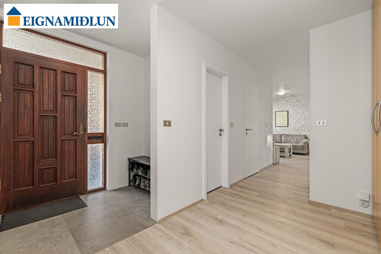 175,9 fm með 21,6 fm bílskúr. 4 svefnherbergi, 2 stofur, nýlega endurnýjað baðherbergi og gestasnyrting, sérinngangur, sérþvottahús og tvennar svalir.