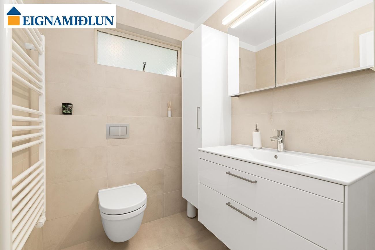 BAÐHERBERGI: Vandað flísalagt nýlega endurnýjað baðherbergi með góðri innréttingu, sturtuklefa beint í gólf með glerskilrúmi og vegghengdu salerni. Gluggi er á baðherberginu.