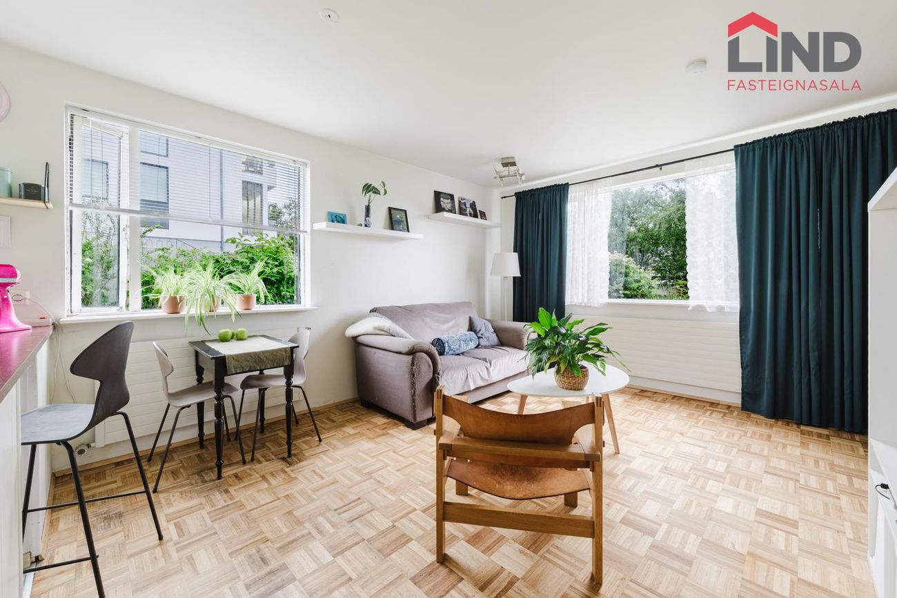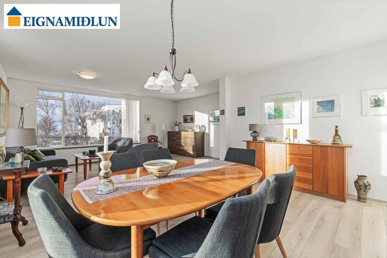 STOFUR: Stofa og borðstofa eru parketlagðar og úr stofu er gengið út á yfirbyggðar svalir í suður.