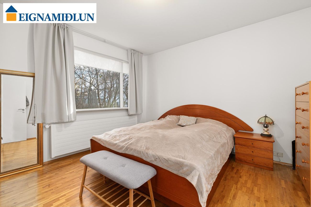 HJÓNAHERBERGI: Rúmgott parketlagt hjónaherbergi með góðum fataskápum. Gengið út á yfirbyggðu suðursvalirnar úr hjónaherberginu.