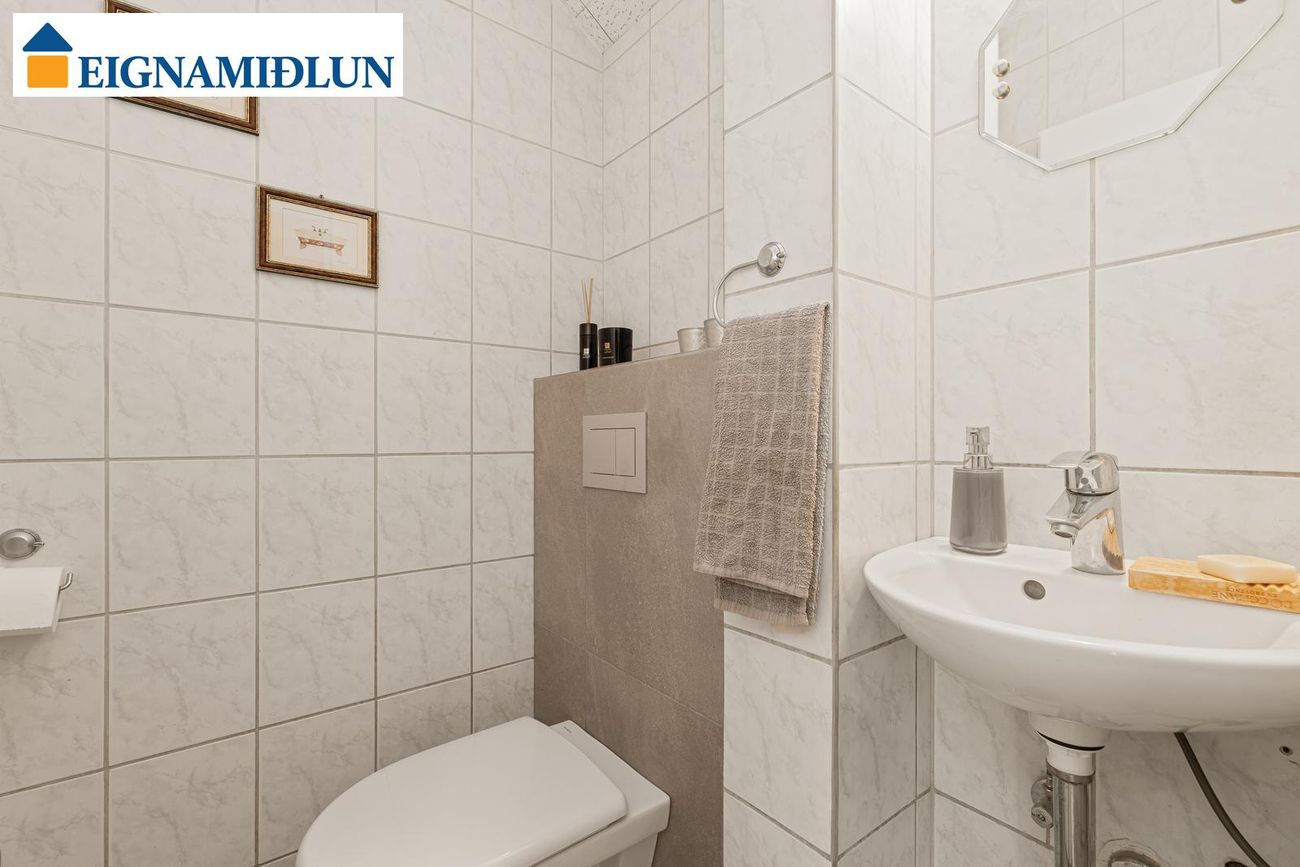 GESTASNYRTING: Endurnýjuð flísalögð gestasnyrting með vegghengdu salerni.