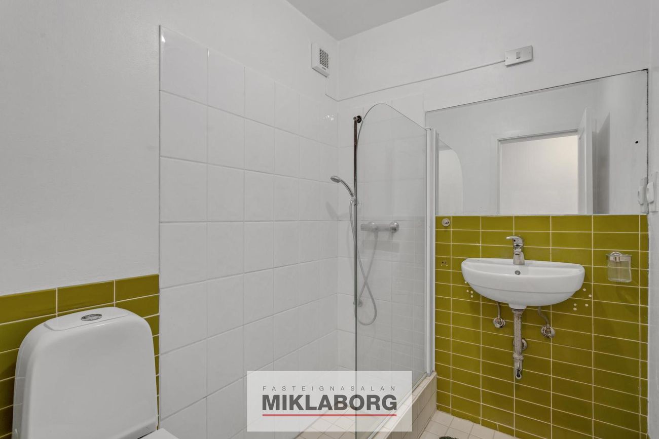 Með sturtu, salerni og skolvask. Flísar á gólfi og hluta veggja.