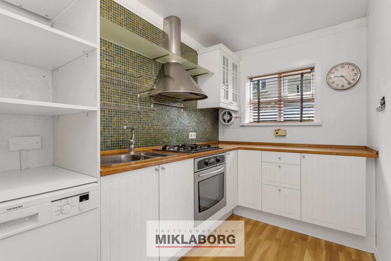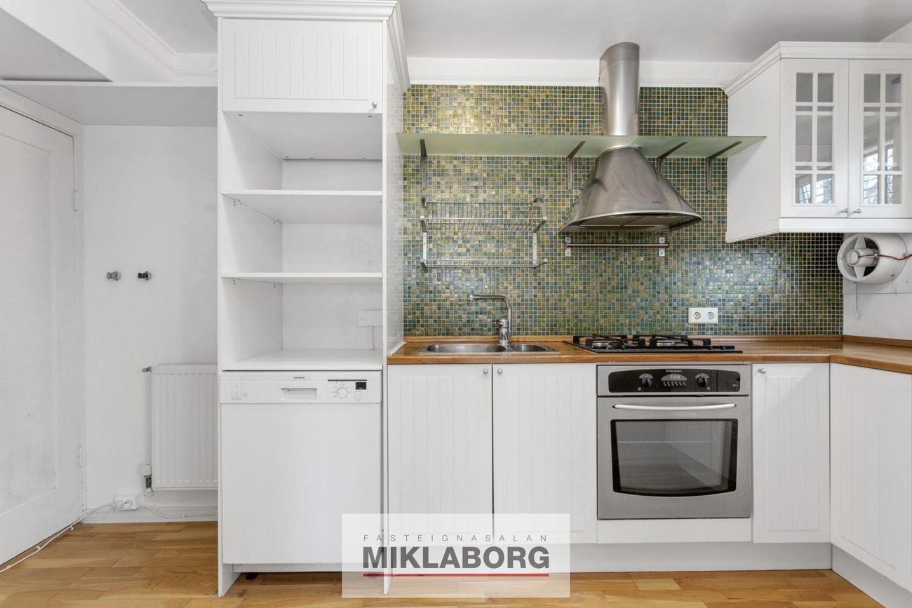 Gaseldavél, bakarofn, vifta, pláss fyrir uppþvottavél og frístandandi ískáp.