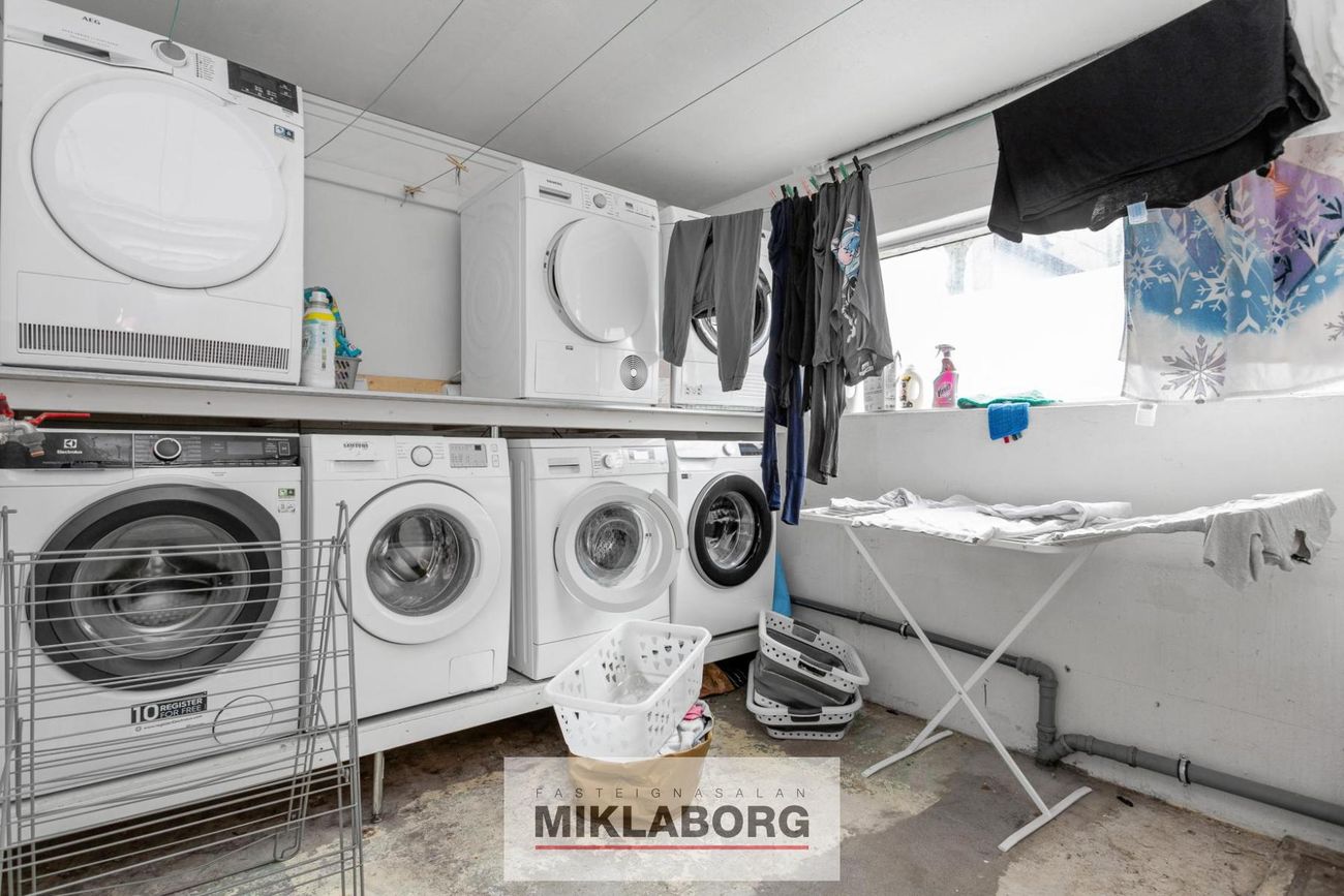 Sameignarsvæði með sérgeymslum fyrir íbúðir og sameiginlegu þvottahúsi.