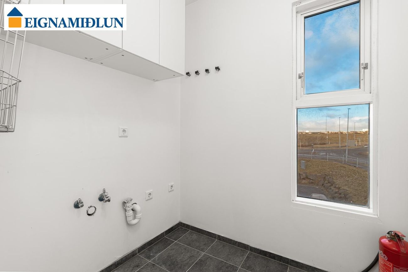 Þvottahús er með flísum á gólfi, hita í gólfi og glugga.