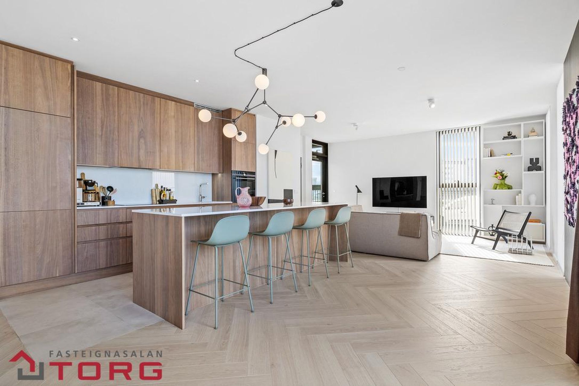 TORG FASTEIGNASALA KYNNIR Í EINKASÖLU: Vönduð 142,6 fm, fjögurra herbergja íbúð á fyrstu hæð í þessu glæsilega húsi við Hallgerðargötu 5, við Kirkjusand í Reykjavík. Íbúðin skiptist í anddyrisgang, hol, hjónasvítu með fataherbergi og baðherbergi, tvö barnaherbergi, alrými með stofu og eldhúsi og tvennar svalir. Gólfhiti í íbúð. Íbúðin er stutt frá miðborg Reykjavíkur og í mikilli nálægð við Laugardalinn.Allar nánari upplýsingar veitir Matthildur Sunna Þorláksdóttir, lögfræðingur og löggiltur fasteignasali, í síma 690-4966 eða .Nánari lýsing: Íbúðin er skráð 131,7 fm og geymsla 10,9 fm, samtala 142,6 fm. Svalir 15,2 fm.Komið er inn í anddyrisgang sem tengist holi þar sem gengið er inn í hjónasvítuna og annað barnaherbergið. Hjónasvítan er með opnu fataherbergi og baðherbergi með viðarlitaðri innréttingu með stein á borði, speglaskáp, flísalagt í hólf og gólf. Baðkar, vegghengt salerni og handlaug í borði. Útgengt er á svalir úr hjónasvítu. Barnaherbergi er með skápum.Gengið er úr holi og inn á gang sem leiðir inn í alrými. Baðherbergi er á ganginum, baðherbergi með viðarlitaðri innréttingu með stein á borði, speglaskáp, flísalagt í hólf og gólf. sturta með skilrúm úr gleri, vegghengt salerni og handlaug í borði. Aðstaða fyrir þvottavél og þurrkara.Komið er inn í opið alrými með eldhúsi og stofu. Eldhús er með viðarlitaðri innréttingu, eyju með góðu vinnuplássi og stein á borði. Ofn í vinnuhæð og innbyggð uppvottavél, ísskápur og frystir.Útgengt er á tvennar svalir frá stofu, þar af aðrar með einstaklega fallegu sjávarútsýni.Parket er á allri íbúð fyrir utan votrými, þar eru flísar. Gólfhiti í öllum rýmum íbúðar.Sér geymsla og sameiginleg hjólageymsla í sameign.Sameiginlegur bílakjallari er undir öllum reitnum, þar sem unnt er að leigja bílastæði gegn rekstrargjaldi (7.500). Einnig geta íbúar fengið aðgang að fleiri bílastæðum gegn hóflegu gjaldi. Bílastæði með hleðslustöðvum fyrir rafbíla eru einnig í bílakjallara.Eignin er frábærlega staðsett, útivistargildi svæðisins er mikið og gott aðgengi er að strandlengjunni og Laugardal. Hallgerðargata tengist gömlum og rótgrónum hverfum á Teigunum og Lækjunum og þaðan er stutt í alla verslun og þjónustu auk nálægðar við Laugardalslaug, Grasagarðinn o.fl.*Málaferli eru í gangi við söluaðila vegna galla. Ekki liggur fyrir niðurstaða í því máli. - Sjá fundargerðir fyrir húsfélag.Forsendur söluyfirlits: Söluyfirlit er samið af fasteignasala í samræmi við ákvæði laga nr. 70/2015. Þær upplýsingar sem fram koma í söluyfirliti þessu eru sóttar í opinberar skrár, til seljanda sjálfs og eftir atvikum til húsfélags. Seljandi veitir upplýsingar um eign í samræmi við upplýsingaskyldu laga um fasteignakaup nr. 40/2002. Fasteignasali sannreynir að þær upplýsingar séu réttar með sjónskoðun á eigninni. Fasteignasali getur ekki fullyrt um ástand og eiginleika þeirra hluta fasteigna sem ekki eru aðgengilegir og sjást ekki berum augum, t.d. lagnir, dren, skólp og þak. Gjöld sem kaupandi þarf að standa straum af vegna kaupanna:Stimpilgjald af kaupsamningi sem er hlutfall af fasteignamati. Stimpilgjald er 0,8% fyrir einstaklinga (0,4% við fyrstu kaup m.v. að lágmarki 50% eignarhlut) og 1,6% fyrir lögaðila. Þinglýsingargjald hvers skjals er kr. 2.700,-. Lántökugjald lánastofnunar skv. gjaldskrá viðkomandi lánveitanda. Umsýsluþóknun fasteignasölu skv. gjaldskrá. Ef um nýbyggingu er að ræða greiðir kaupandi skipulagsgjald, 0,3% af brunabótamati, þegar það er lagt á. TORG fasteignasala bendir fasteignakaupendum á ríka skoðunarskyldu kaupenda sem kveðið er á í lögum um fasteignakaup nr.40/2002. Skorað er á kaupendur að kynna sér vandlega ástand fasteigna og nýta til þess aðstoð sérfræðinga. Sömuleiðis er bent á upplýsingaskyldu seljanda samanber 26.gr. Laga nr.40/2002 um fasteignakaup og 25.gr. laga nr.26/1994 um fjöleignarhús. Seljanda er bent á að kynna sér tilvitnaðar lagagreinar.