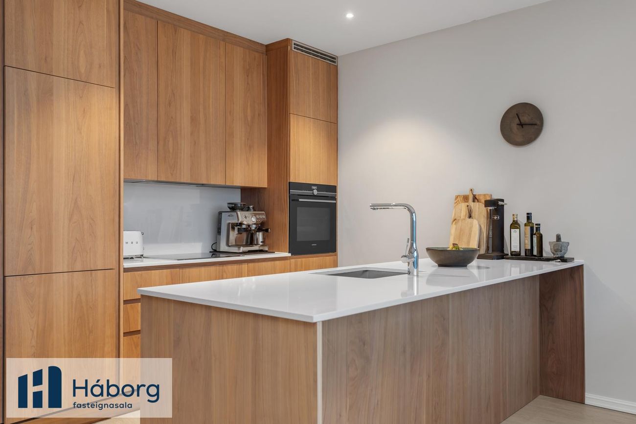 Eldhúsið er opið og með eldhúseyju. Eldhústæki eru vönduð frá Simens. Innbyggður ísskápur og uppþvottavél fylgja.