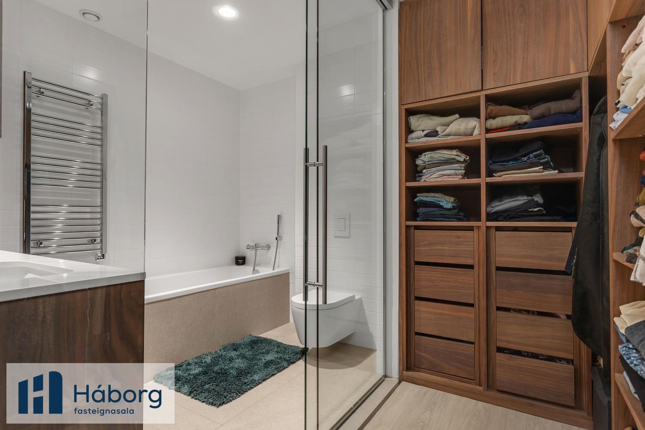 Á vinstri hönd er gott baðherbergi með sturtu og aðstöðu fyrir þvottavél og þurrkara. Góð innrétting sem gerir ráð fyrir vélum í vinnuhæð.