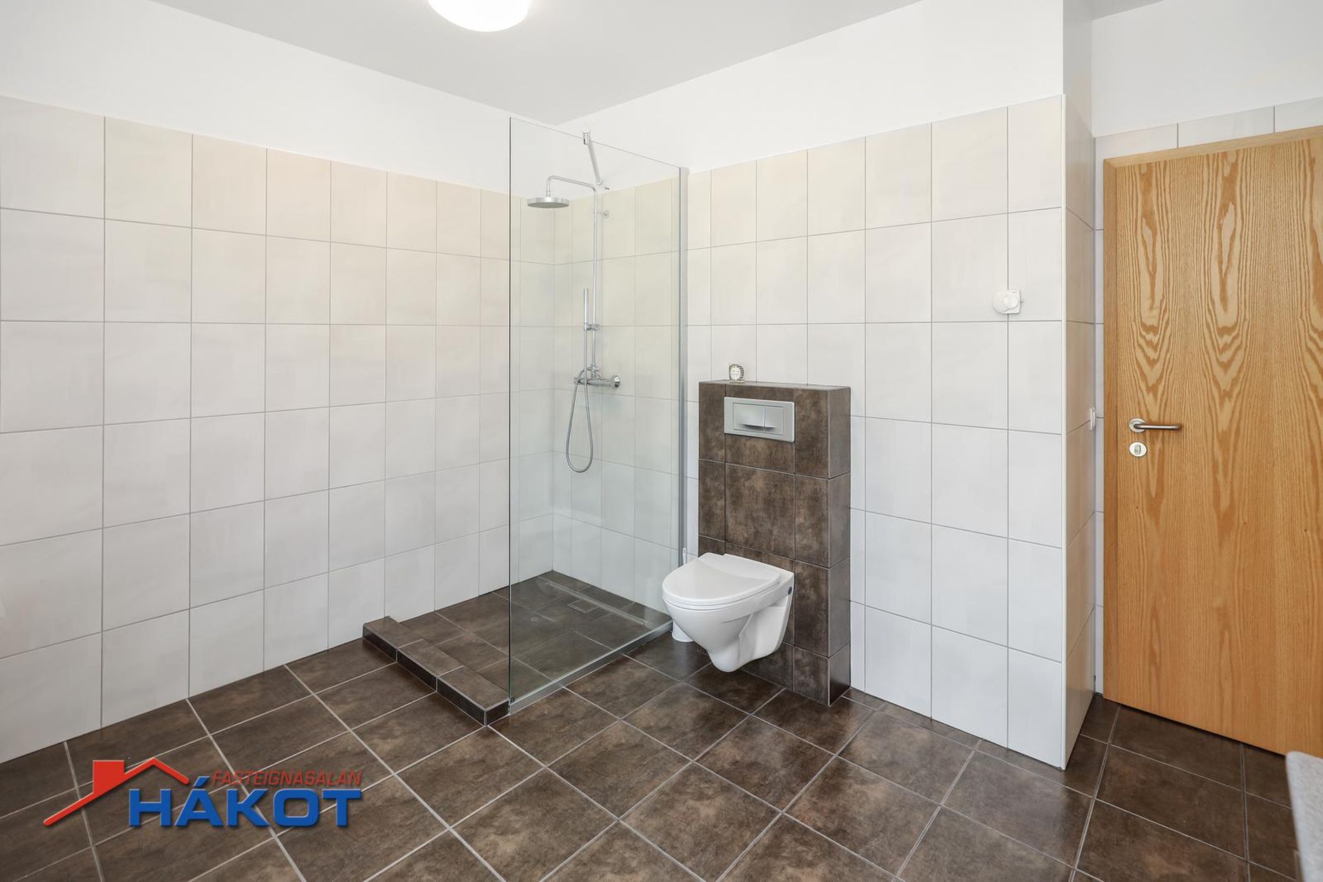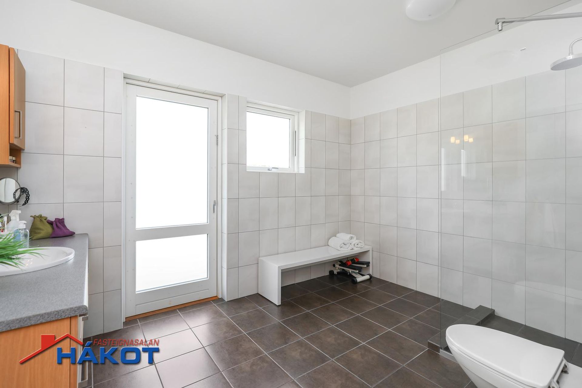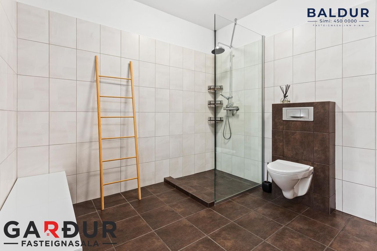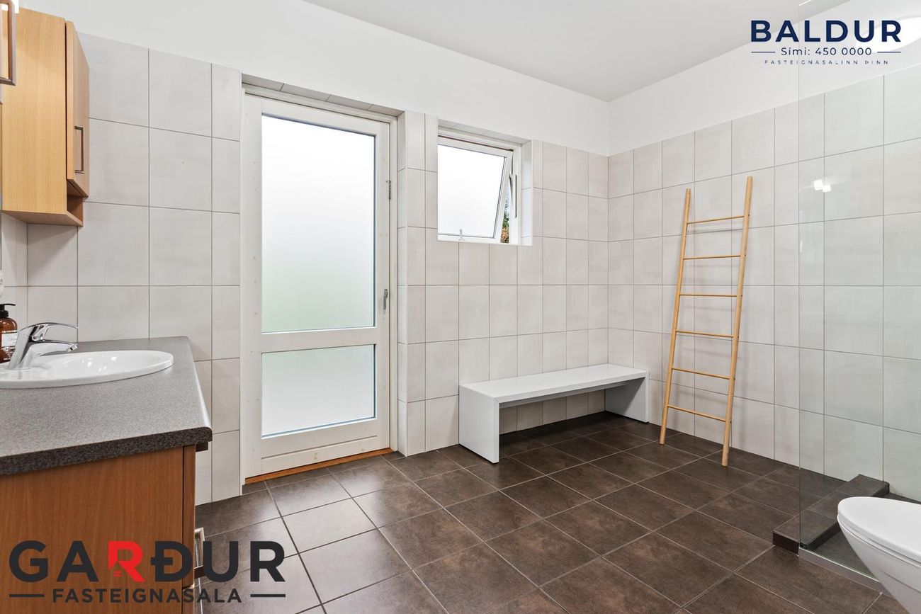 heitur pottur er staðsettur. Rúmgott rými. Flísalagt í hólf og gólf. Upphengt salerni. Ljós viðarinnrétting og flísalögð sturta með gleri.