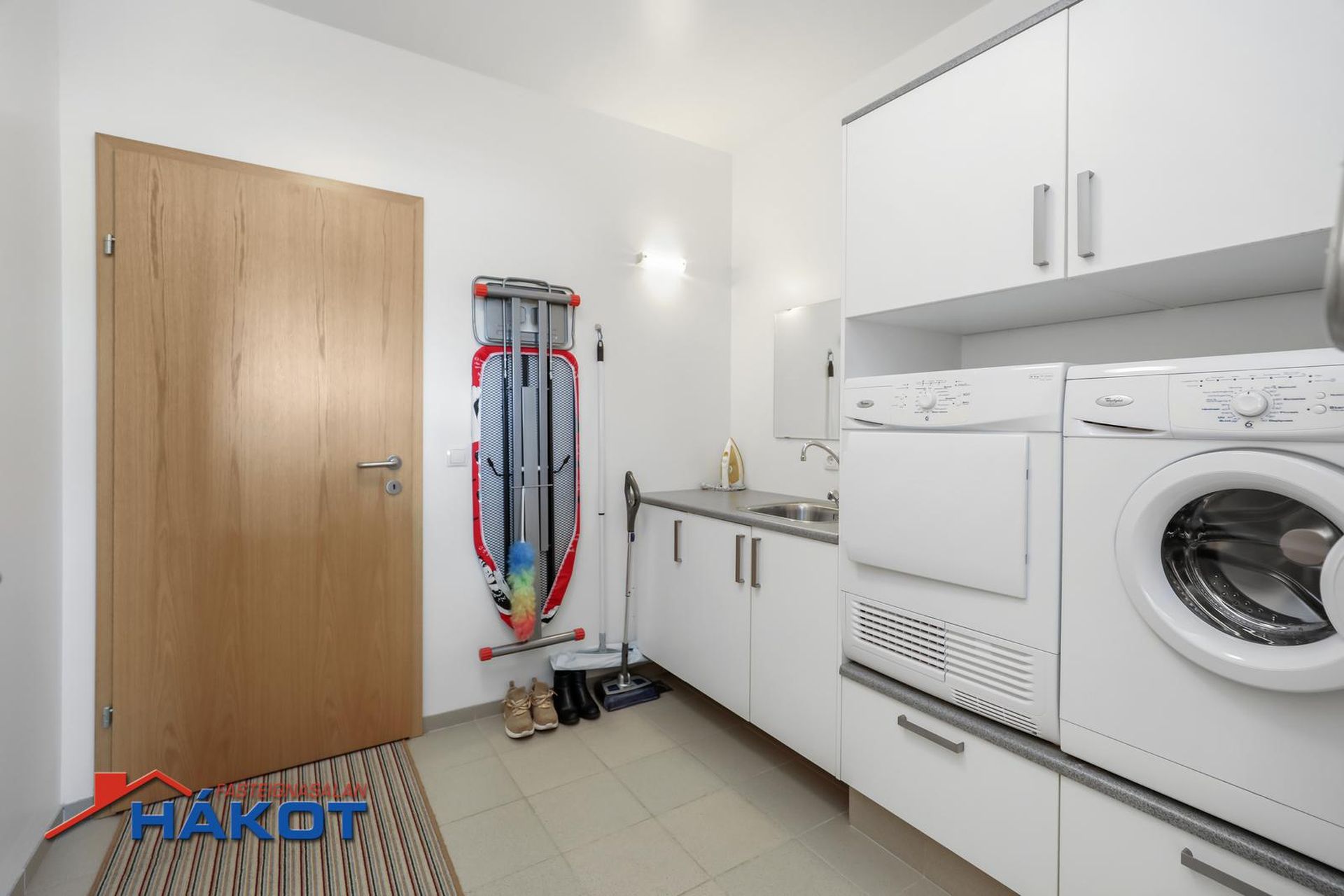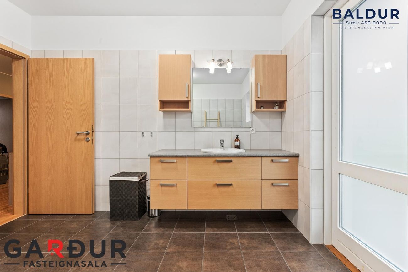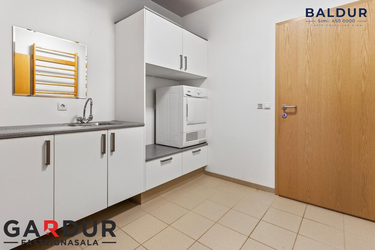 Þvottahús: Flísar á gólfi, hvít innrétting og skolvaskur. Innangengt frá þvottahúsi í bílskúr.